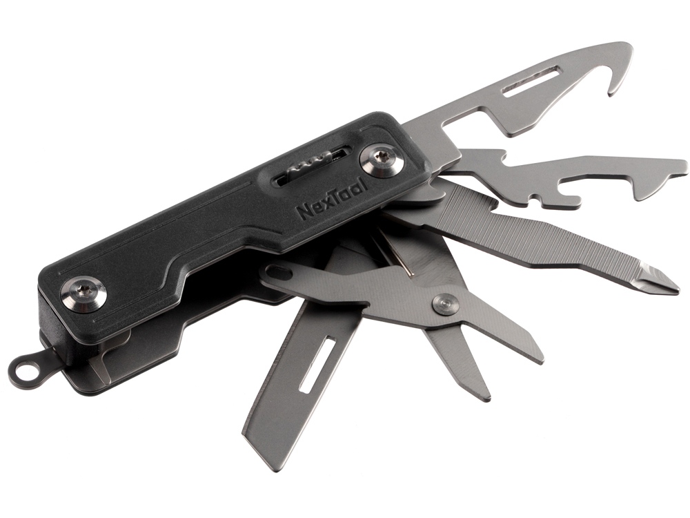Нож-брелок NexTool Knight EDC – складной многофункциональный нож 10 в 1. Вес составляет всего 88 грамм, а размеры настолько малы, что его можно использовать как брелок для ключей, а так же этот мультитул незаменимая вещь в повседневной жизни, в походе, на охоте или рыбалке. Корпус состоит из прочного, матового ABS пластика, который обволакивает высокопрочную сталь марки 20Cr13 (корпус) и 30Cr13 (нож). Марка стали 30Cr13 (производство Германия) нержавеющая (коррозионно-стойкая). Ножи этой марки стали износостойки, легко переносят удары и не будут раскалываться при пользовании. Перечень функционала: нож (длина лезвия 5 см), аварийный молоток для разбивания стекла, открывалка консервных банок, стропорез (разрежет ремень, веревку, шнурки), ножницы, держатель для телефона (вертикальный и горизонтальный), ключ для извлечения сим-карты, напильник, открывалка для бутылок, отвертка.