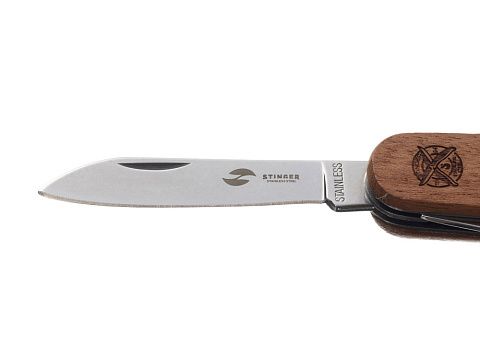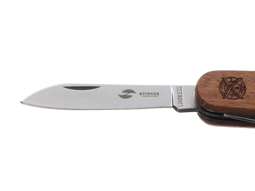 Нож перочинный STINGER имеет 10 функций: 1. Большое лезвие 2. Консервный нож с: 3. – Малой отвёрткой 4. Шило с: 5. – Иглой 6. Штопор 7. Открывалка для бутылок с: 8. – Отвёрткой 9. – Инструментом для снятия изоляции 10. Кольцо для ключей ХАРАКТЕРИСТИКИ Материалы: • лезвие/инструменты: нержавеющая сталь AISI 420, твердость 44-48 HRC • рукоять: нержавеющая сталь AISI 420, твердость 44-48 HRC • накладки рукояти: АБС-пластик Размер: 90 мм Вес: 63 г Цвет накладок рукояти: коричневый Накладки рукояти ножа не подлежат замене. Упаковка: картонная коробка