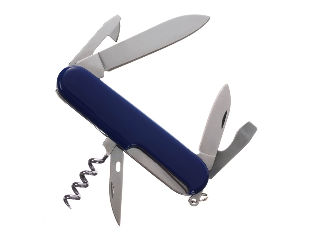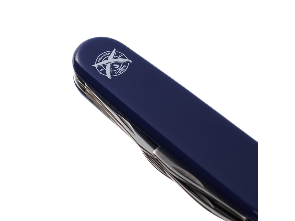 Нож перочинный STINGER имеет 11 функций: 1. Большое лезвие 2. Малое лезвие 3. Консервный нож с: 4. - Малой отверткой 5. Штопор 6. Шило с: 7. - Иглой 8. Открывалка для бутылок с: 9. - Отверткой 10. - Инструментом для снятия изоляции 11. Кольцо для ключей ХАРАКТЕРИСТИКИ Материалы • лезвие/инструменты: нержавеющая сталь 420, твердость 44-48 HRC • рукоять: нержавеющая сталь 420, твердость 44-48 HRC • накладки рукояти: АБС-пластик Размеры • Размеры ножа: 90х26,5х14 мм • Общая длина: 160,4/131,3 мм • Длина клинка: 67,8/40,4 мм • Наибольшая ширина клинка: 12,4/9,4 мм • Толщина обуха: 2,5/1,5 мм • Длина рукояти: 92,6/90,9 мм • Ширина рукояти (в ср.части): 20,6 мм • Толщина рукояти (в ср.части): 15 мм Вес: 80 г Цвет накладок рукояти: синий Накладки рукояти ножа не подлежат замене. Упаковка: картонная коробка