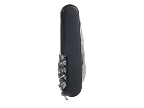 Нож перочинный STINGER имеет 13 функций: 1. Большое лезвие 2. Консервный нож с: 3. – Малой отвёрткой 4. Малое лезвие 5. Открывалка для бутылок с: 6. – Отвёрткой 7. – Инструментом для снятия изоляции 8. Ножницы 9. Многофункциональный крючок 10. Штопор 11. Шило с: 12. – Иглой 13. Кольцо для ключей ХАРАКТЕРИСТИКИ Материалы: • лезвие/инструменты: нержавеющая сталь AISI 420, твердость 44-48 HRC • рукоять: нержавеющая сталь AISI 420, твердость 44-48 HRC • накладки рукояти: АБС-пластик Размер: 90 мм Вес: 114 г Цвет накладок рукояти: черный Накладки рукояти ножа не подлежат замене. Упаковка: картонная коробка