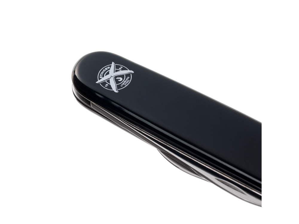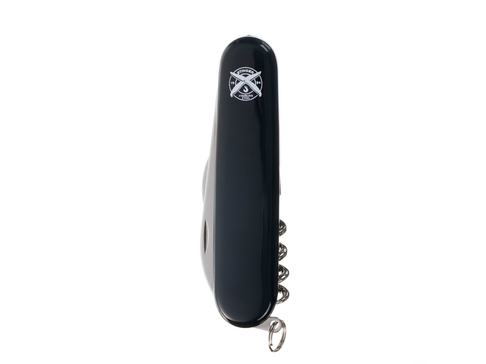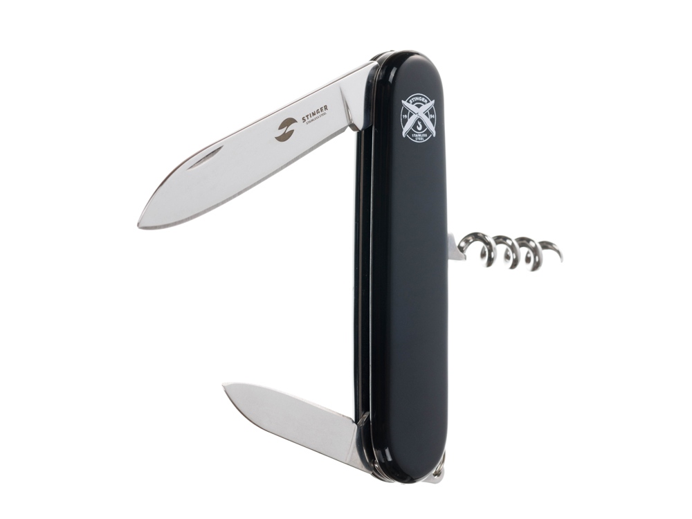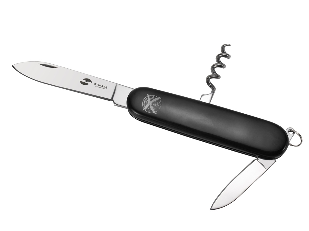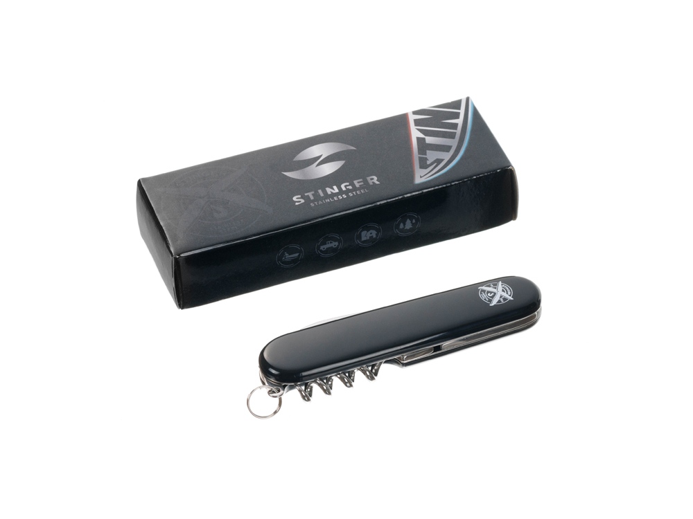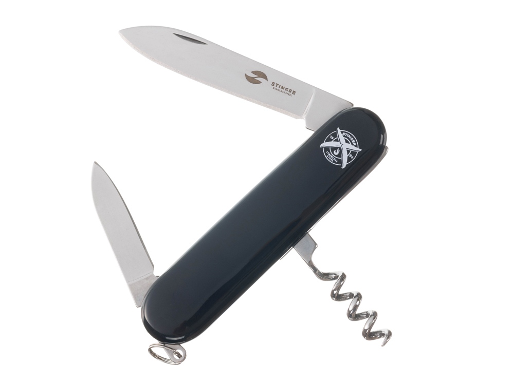 Нож перочинный STINGER имеет 4 функции: 1. Большое лезвие 2. Малое лезвие 3. Штопор 4. Кольцо для ключей ХАРАКТЕРИСТИКИ Материалы • лезвие/инструменты: нержавеющая сталь 420, твердость 44-48 HRC • рукоять: нержавеющая сталь 420, твердость 44-48 HRC • накладки рукояти: АБС-пластик Размеры • Размеры ножа: 90х26,5х14 мм • Общая длина: 160/131, мм • Длина клинка: 67,7/40,2 мм • Наибольшая ширина клинка: 12,3/9,2 мм • Толщина обуха: 2,5/1,5 мм • Длина рукояти: 92,3/90,9 мм • Ширина рукояти (в ср.части): 20,3 мм • Толщина рукояти (в ср.части): 12,2 мм Вес: 55 г Цвет накладок рукояти: черный Накладки рукояти ножа не подлежат замене. Упаковка: картонная коробка