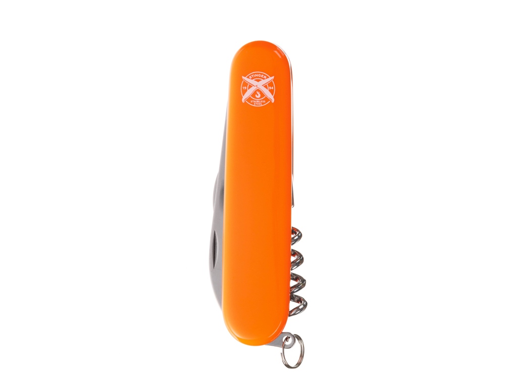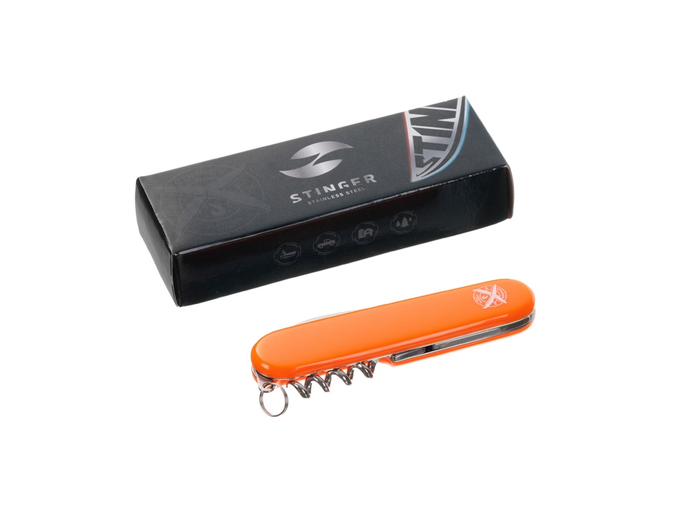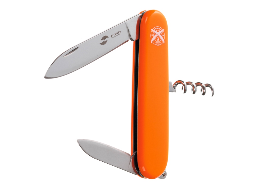 Нож перочинный STINGER имеет 4 функции: 1. Большое лезвие 2. Малое лезвие 3. Штопор 4. Кольцо для ключей ХАРАКТЕРИСТИКИ Материалы • лезвие/инструменты: нержавеющая сталь 420, твердость 44-48 HRC • рукоять: нержавеющая сталь 420, твердость 44-48 HRC • накладки рукояти: АБС-пластик Размеры • Размеры ножа: 90х26,5х14 мм • Общая длина: 160/131, мм • Длина клинка: 67,7/40,2 мм • Наибольшая ширина клинка: 12,3/9,2 мм • Толщина обуха: 2,5/1,5 мм • Длина рукояти: 92,3/90,9 мм • Ширина рукояти (в ср.части): 20,3 мм • Толщина рукояти (в ср.части): 12,2 мм Вес: 55 г Цвет накладок рукояти: черный Накладки рукояти ножа не подлежат замене. Упаковка: картонная коробка