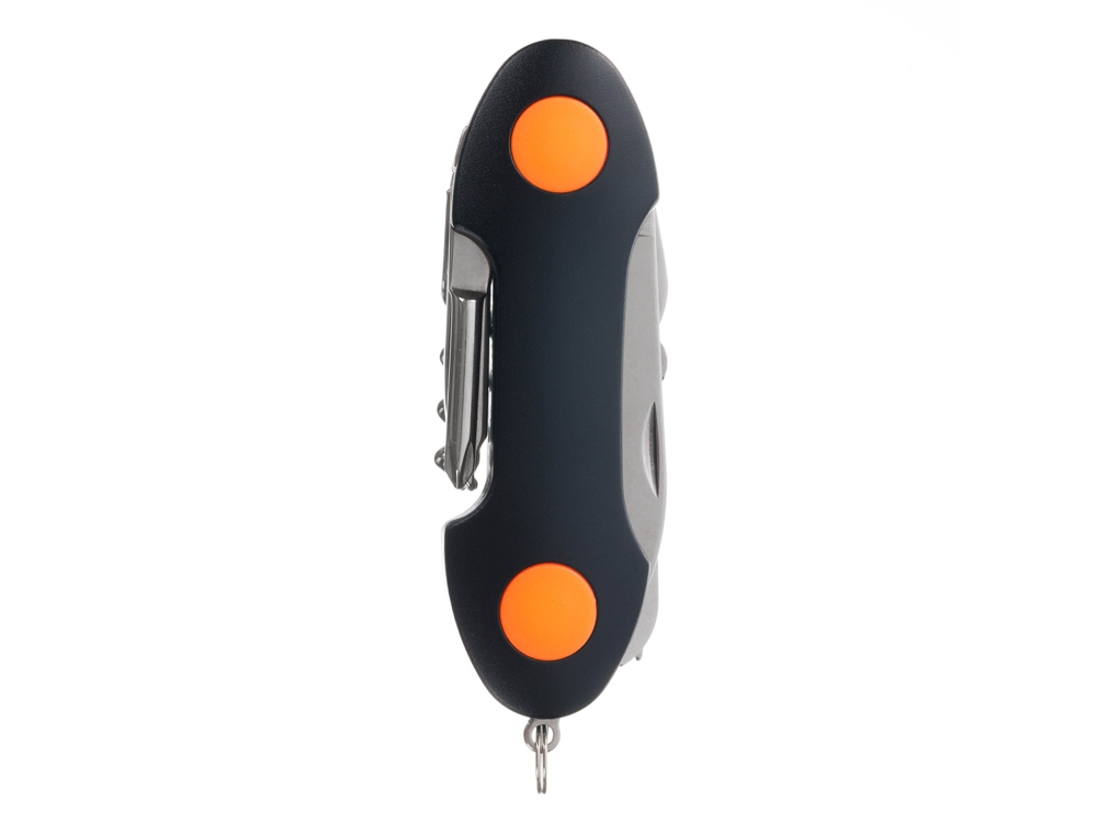 Нож перочинный STINGER имеет 15 функций: 1. Большое лезвие 2. Пила по дереву 3. Инструмент для чистки рыбы с: 4. - Инструментом для извлечения рыболовного крючка 5. Ножницы 6. Консервный нож 7. Открывалка для бутылок с: 8. - Отверткой 9. Крестовая отвертка 10. Ледокол 11. Пилка для ногтей с: 12. - Инструментом по уходу за ногтями 13. Игла 14. Штопор 15. Кольцо для ключей Материалы • лезвие/инструменты: нержавеющая сталь 420, твердость 44-48 HRC • рукоять: нержавеющая сталь 420, твердость 44-48 HRC • накладки рукояти: алюминий, полипропилен Размеры • Размеры ножа: 95х30х20 мм • Общая длина: 156,7 мм • Длина клинка: 60,1 мм • Наибольшая ширина клинка: 11,9 мм • Толщина обуха: 1,7 мм • Длина рукояти: 96,6 мм • Ширина рукояти (в ср.части): 24,7 мм • Толщина рукояти (в ср.части): 21,7 мм Вес: 139 г Цвет накладок рукояти: черный, оранжевый Накладки рукояти ножа не подлежат замене. Упаковка: картонная коробка
