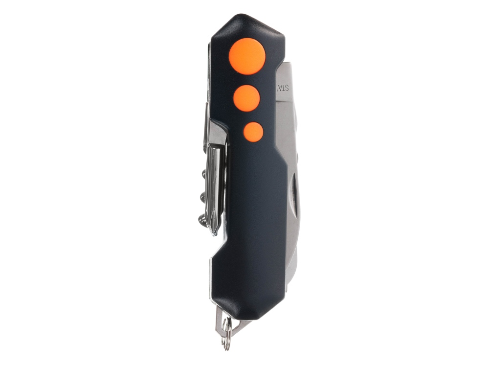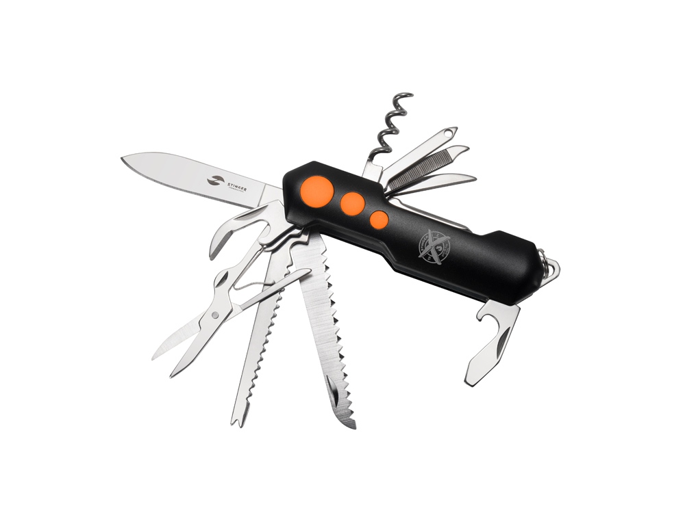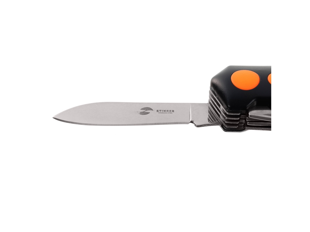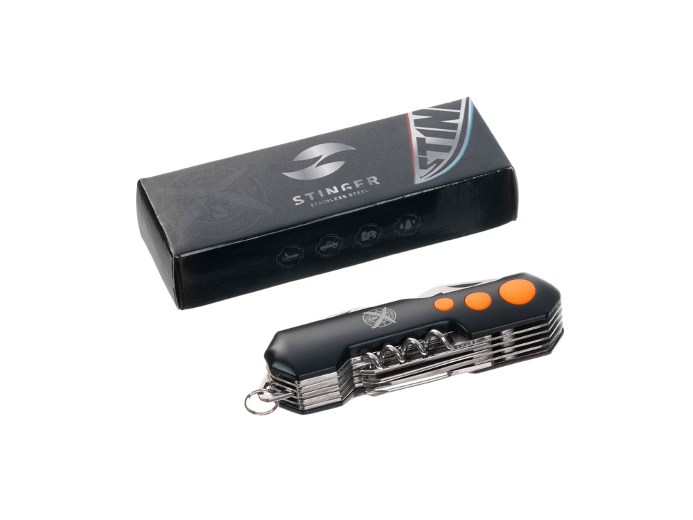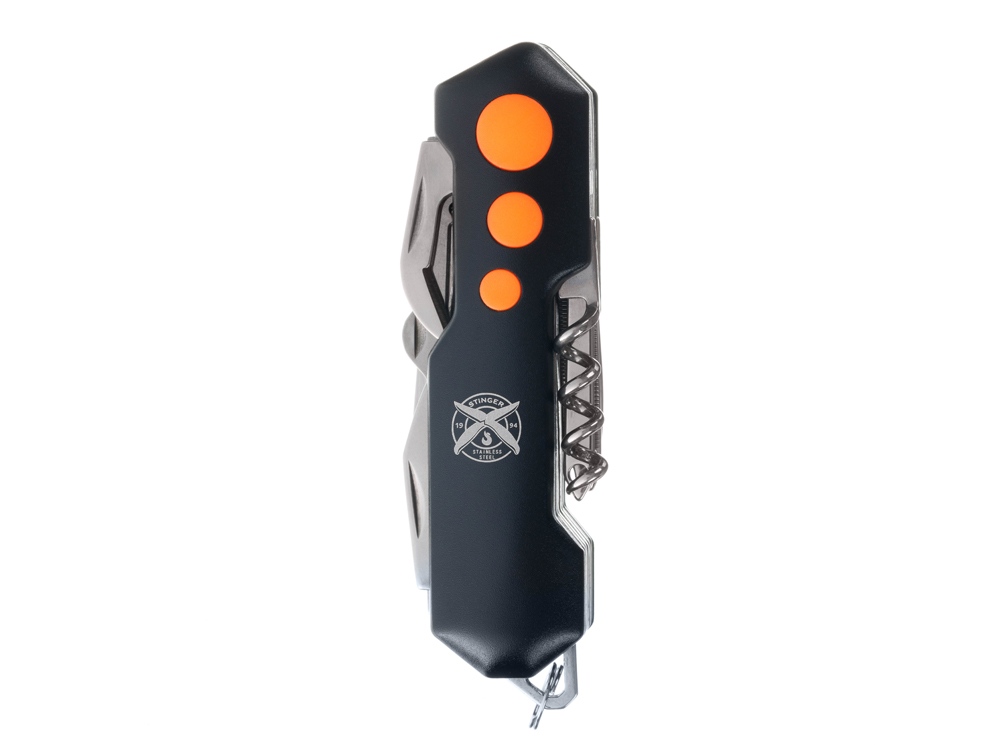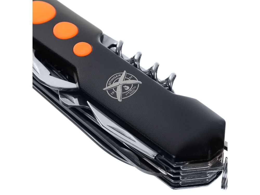 Нож перочинный STINGER имеет 15 функций: 1. Большое лезвие 2. Пила по дереву 3. Инструмент для чистки рыбы с: 4. - Инструментом для извлечения рыболовного крючка 5. Ножницы 6. Консервный нож 7. Открывалка для бутылок с: 8. - Отверткой 9. Крестовая отвертка 10. Ледокол 11. Пилка для ногтей с: 12. - Инструментом по уходу за ногтями 13. Игла 14. Штопор 15. Кольцо для ключей Материалы • лезвие/инструменты: нержавеющая сталь 420, твердость 44-48 HRC • рукоять: нержавеющая сталь 420, твердость 44-48 HRC • накладки рукояти: алюминий, полипропилен Размеры • Размеры ножа: 98х30х23 мм • Общая длина: 158,4 мм • Длина клинка: 60,6 мм • Наибольшая ширина клинка: 11,9 мм • Толщина обуха: 1,7 мм • Длина рукояти: 97,8 мм • Ширина рукояти (в ср.части): 27,4 мм • Толщина рукояти (в ср.части): 22,8 мм Вес: 156 г Цвет накладок рукояти: черный, оранжевый Накладки рукояти ножа не подлежат замене. Упаковка: картонная коробка