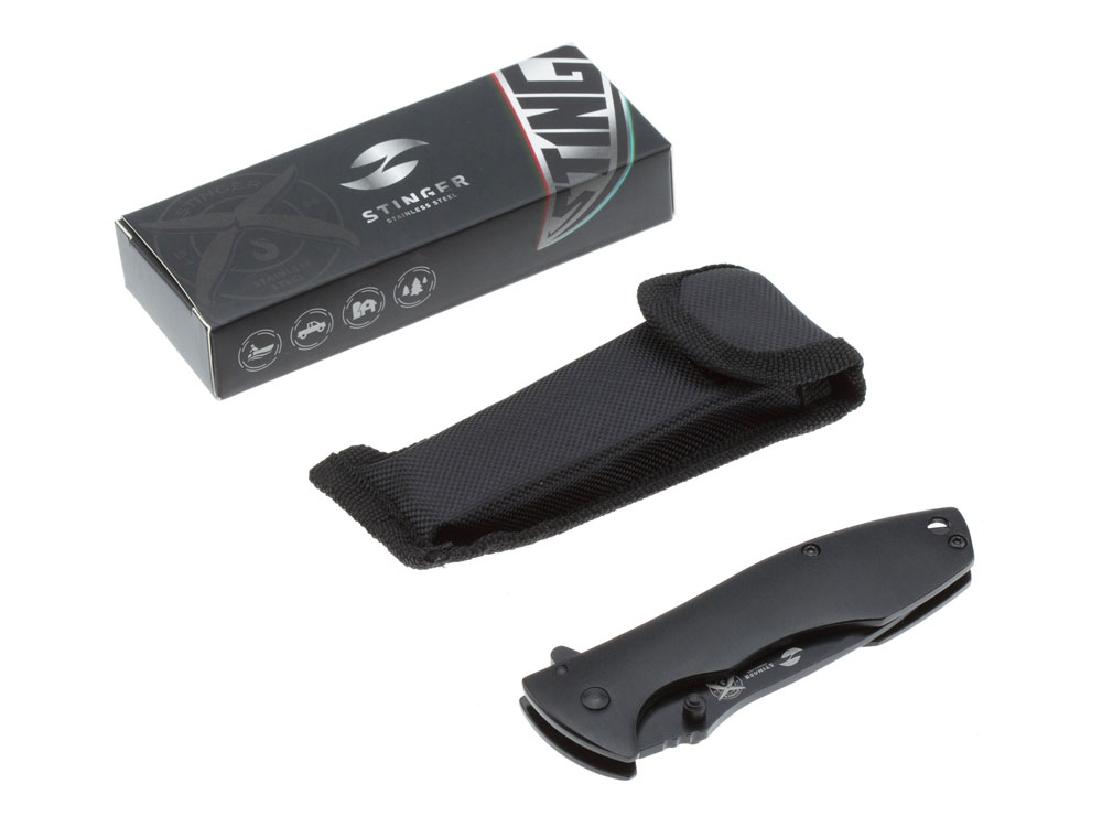 НОЖ СКЛАДНОЙ STINGER Материал лезвия: нержавеющая сталь марки 3Cr13 Материал рукояти: сталь + алюминий Фиксатор лезвия: Frame Lock Длина ножа: 185 мм Длина клинка: 80 мм Толщина клинка: 3 мм Вес: 103 г Цвет рукояти: матовый чёрный Особенности: лезвие с серрейторной кромкой, рукоять с клипом и отверстием под темляк Метод открывания клинка: шпенёк (подпальцевый упор на лезвии) В комплекте: нейлоновый чехол
