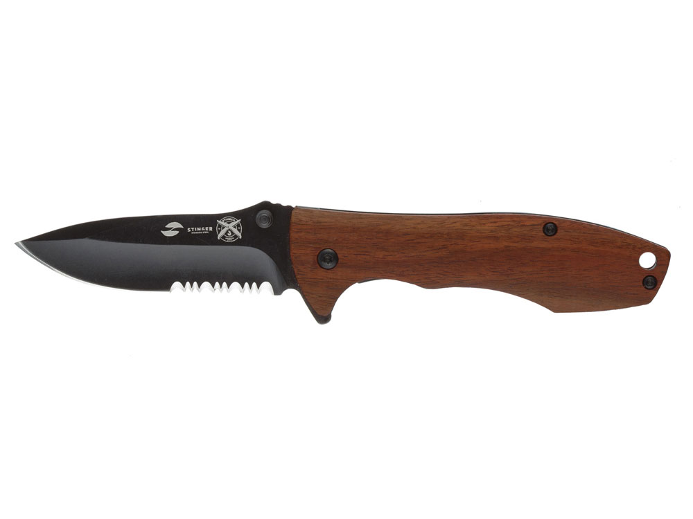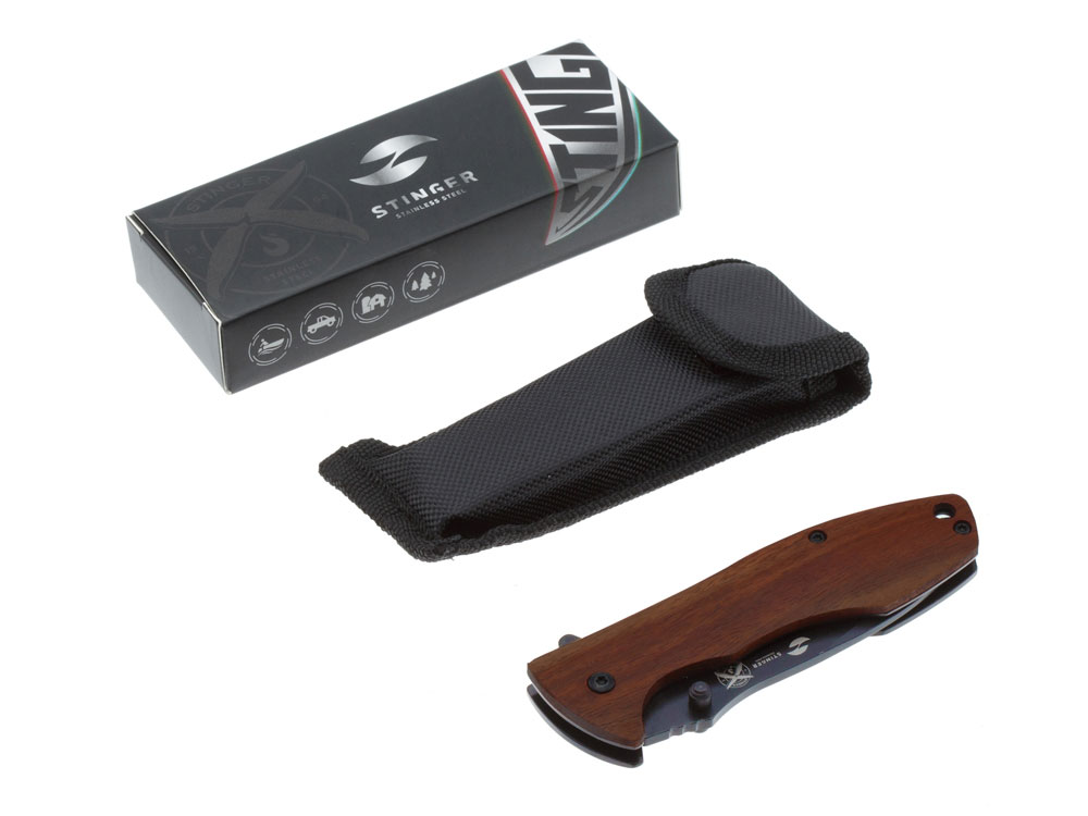 НОЖ СКЛАДНОЙ STINGER Материал лезвия: нержавеющая сталь марки 3Cr13 Материал рукояти: сталь + сандаловое дерево Фиксатор лезвия: Frame Lock Длина ножа: 185 мм Длина клинка: 80 мм Толщина клинка: 3 мм Вес: 112 г Цвет рукояти: чёрный + красное сандаловое дерево Особенности: лезвие с серрейторной кромкой, рукоять с клипом и отверстием под темляк Метод открывания клинка: шпенёк (подпальцевый упор на лезвии) В комплекте: нейлоновый чехол