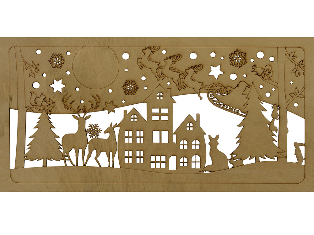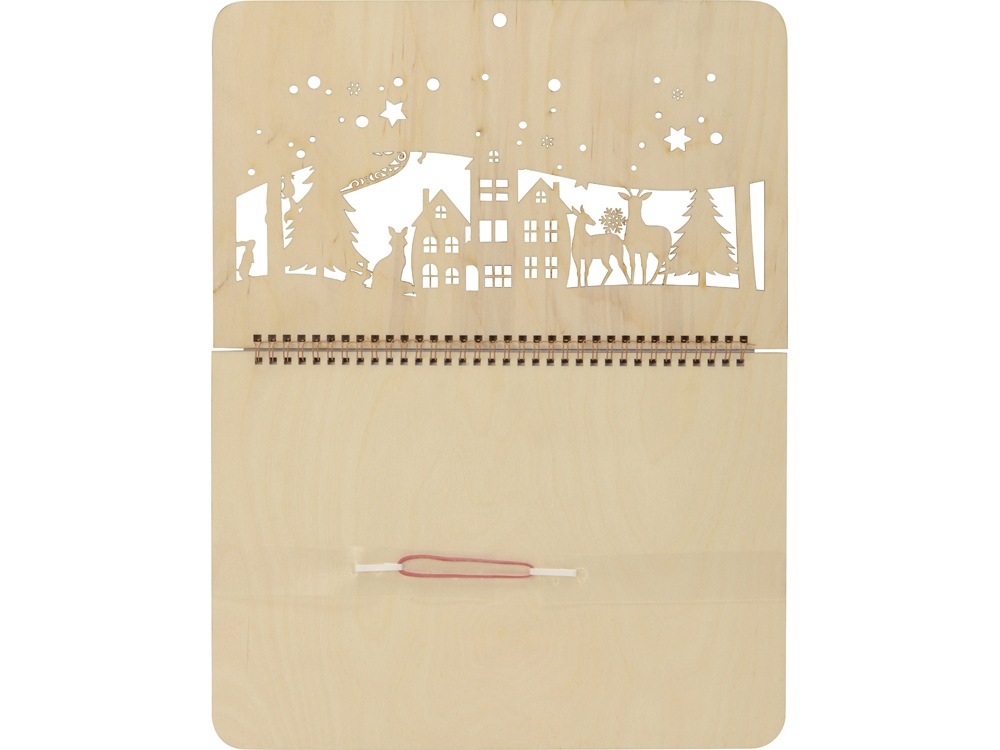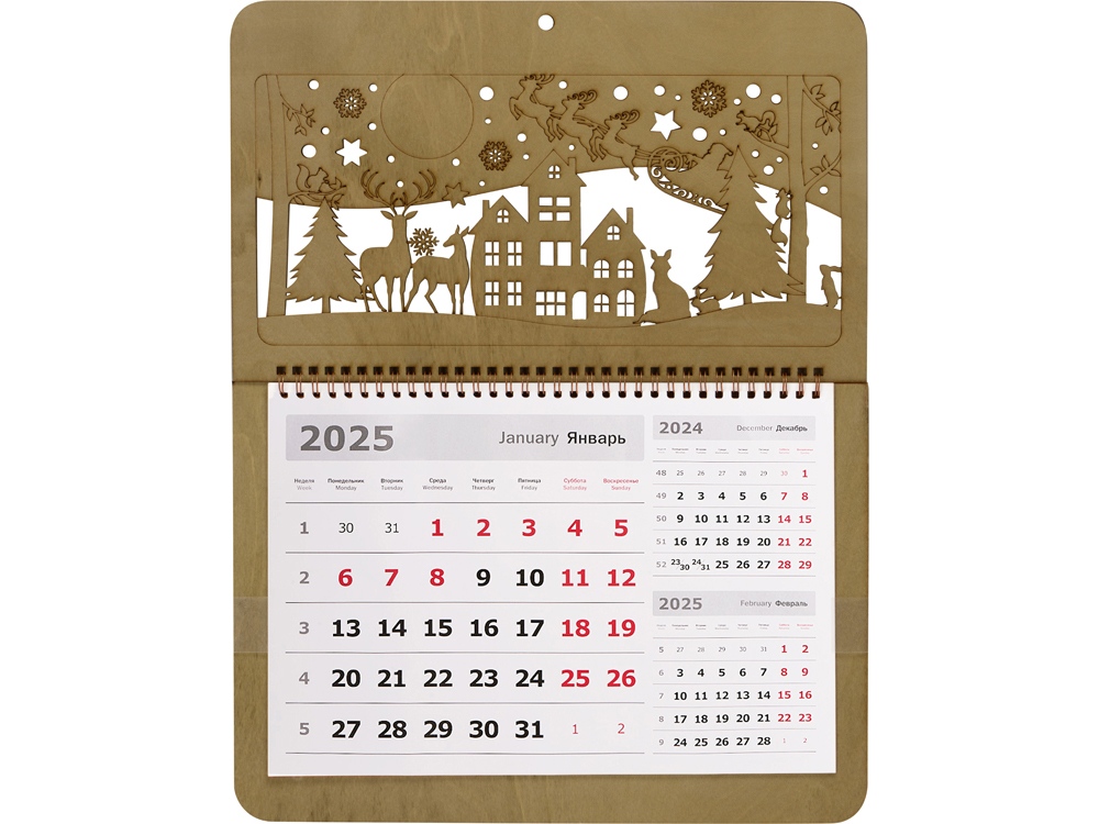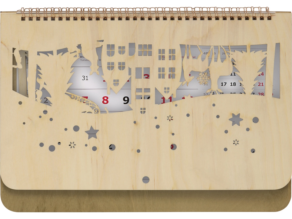 Настенный перекидной календарь имеет необычную обложку, в роли которой выступают фанерные крышки. Нижняя крышка сплошная, верхняя — резная, ажурная, с вырезанным новогодним пейзажем и большим полем под нанесение логотипа или надписи, которая органично впишется в облик календаря. Квартальный блок календаря изготовлен из офсетной бумаги 90 грамм и включает в себя 12 листов. Каждый лист содержит крупный календарь на текущий месяц и два малых на предшествующий и будущий соответственно, что очень удобно для планирования. В комплект входит красный курсор-бегунок для выделения текущей даты.