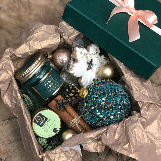 | Состав | интерьерная свеча в стеклянной баночке, имбирный пряник ручной работы, шар на елку, мед-суфле Peroni, декор |