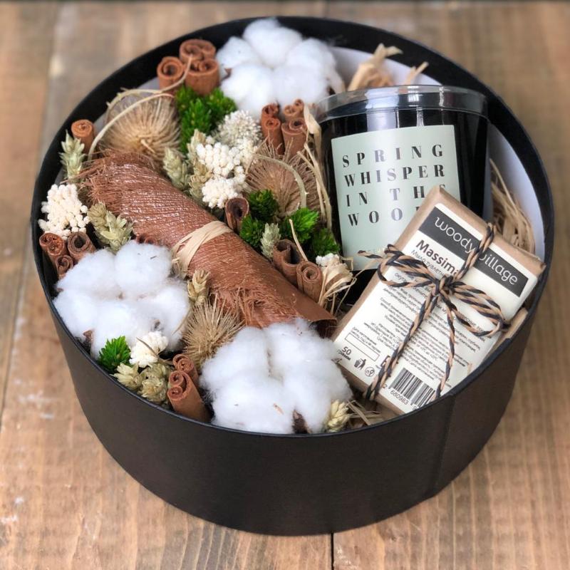 | Состав | свеча интерьерная в стеклянном стакане, мыло ручной работы с ароматом Massima, композиция из сухоцветов |