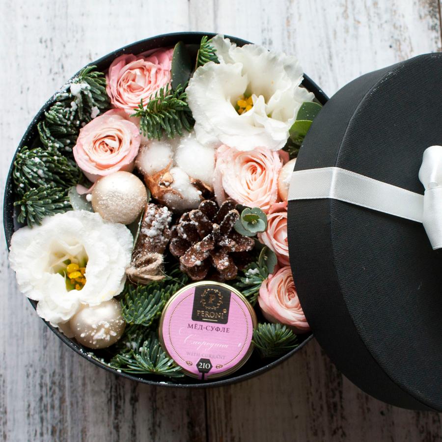 Состав мед-суфле, кустовая роза, эустома, шишки, эвкалипт, шарики, хлопок, открытка.