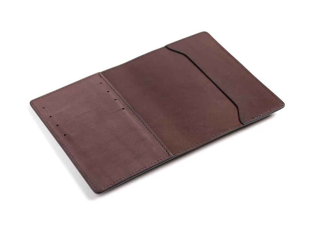 Классическая обложка из дублированной кожи, прокрашенные края, аккуратный шов, прорези для четырёх карт, место для паспорта и документов на машину.