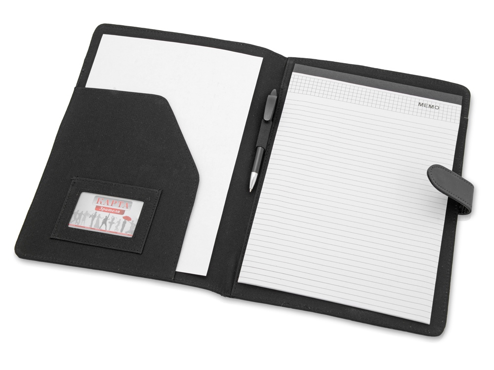Стильная папка для документов с блокнотом и карманом под визитки - практичный бизнес-аксессуар, который обязательно пригодится. Папка закрывается на кнопку. На папку можно нанести символику организации при помощи тиснения.