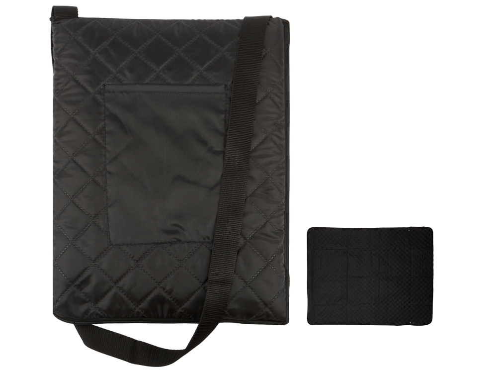 Двухсторонний плед с водоотталкивающим покрытием с одной стороны и мягким флисом с другой. Складывается в сумку на плечо и фиксируется с помощью молнии. В собранном виде имеет регулируемый по длине ремень для переноски и наружный карман для мелочей.