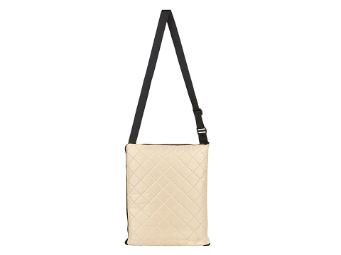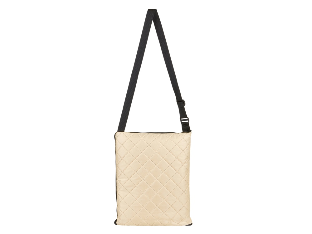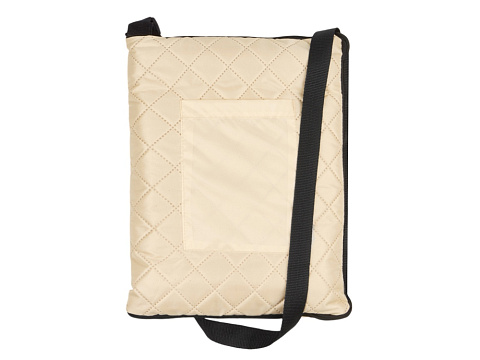 Двухсторонний плед с водоотталкивающим покрытием с одной стороны и мягким флисом с другой. Складывается в сумку на плечо и фиксируется с помощью молнии. В собранном виде имеет регулируемый по длине ремень для переноски и наружный карман для мелочей.