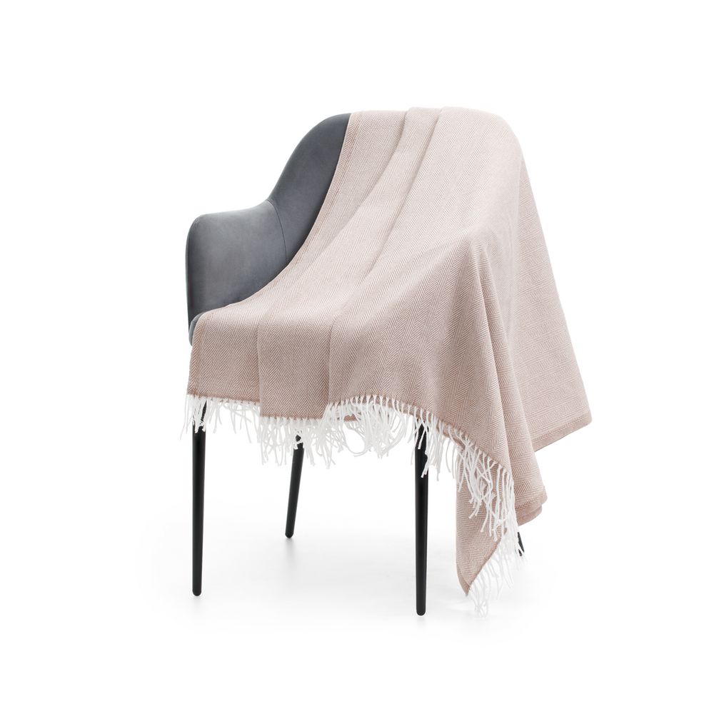 Классический рисунок «елочка» не слишком привлекает внимание, но в то же время добавляет изюминки. Смешанный состав пряжи продлевает срок службы и существенно облегчает уход за пледом.