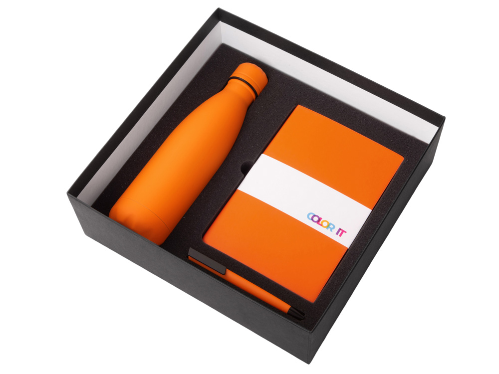 Color It — линейка, в которую входят хиты мерча в десяти самых популярных цветах. Еще никогда собрать сет под свой брендбук не было так просто. Широкая цветовая палитра серии позволяет создать идеальный набор в едином оттенке Pantone. Все товары имеют тактильно приятное покрытие софт-тач. Сет поставляется в коробке: мы продумали все, включая подарочную упаковку, за вас — осталось нанести лого! Классическая форма термобутылки сочетается с продуманной и технологичной конструкцией: вакуумная теплоизоляция и двойные стенки бутылки обеспечивают качественное сохранение температуры напитка до 24-х часов! Блокнот имеет твёрдую обложку и 256 страниц в линейку, даты не указаны, что позволяет начать вести блокнот в любой удобный день года. Ляссе окрашено в тон обложки. Тонкое письмо ручки обеспечивается пишущим узлом с толщиной письма 0,5 мм с нажимным механизмом. - бумага соответствует стандартам FSC; - софт-тач покрытие на всех предметах набора; - объём бутылки: 500 мл; - подарочная упаковка с дизайнерской бумагой уже включена в набор.