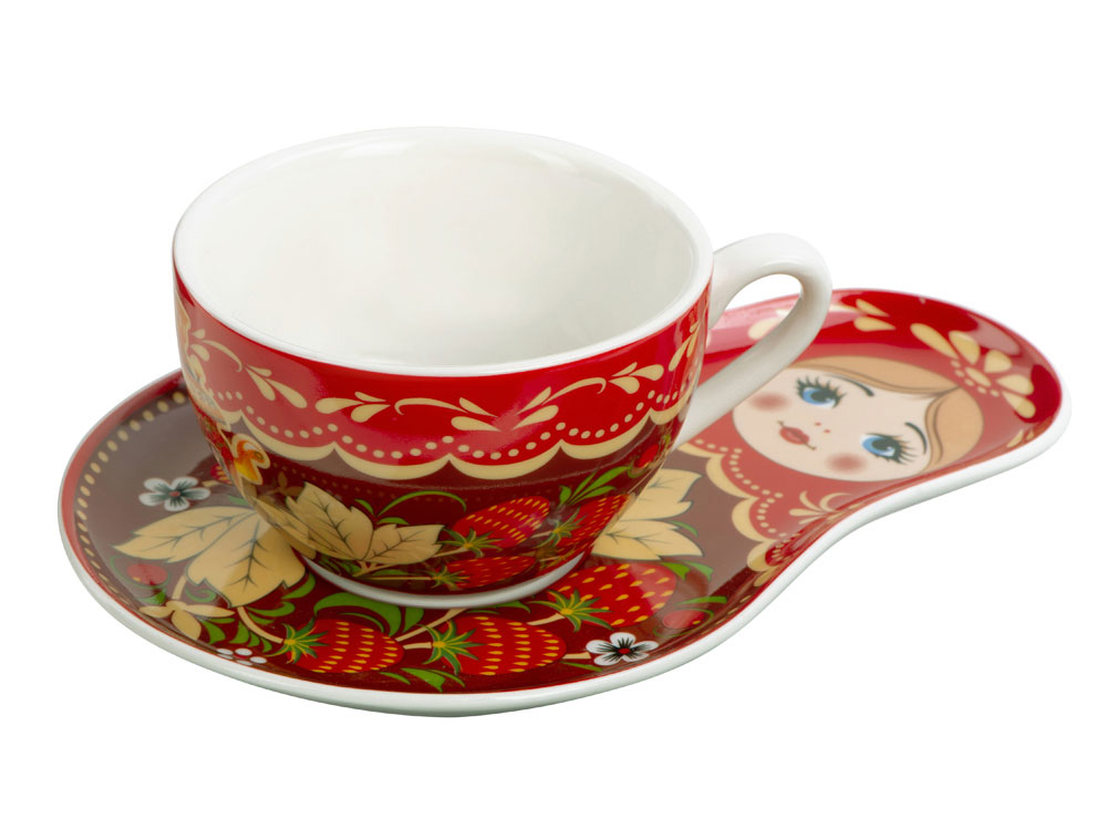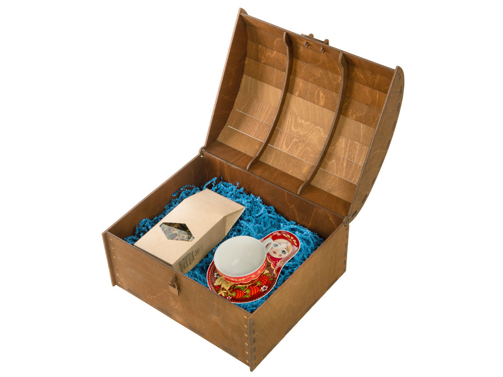 В наборе вы найдете необычную чайно-кофейную пару с подставкой в виде русской Матрешки, которая является одним из главных символов России и чай Малина с мятой травяной, 70 г. Набор поставляется в большой деревянной коробке в виде сундука с замочком.