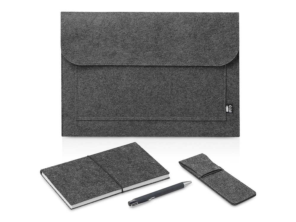 Стильный и функциональный набор для тех, кто ценит простоту и экологичность. В комплект входят: • Блокнот A5 в мягкой обложке из переработанного фетра, • Шариковая кнопочная ручка в бумажном корпусе с пластиковыми деталями, • Пенал для ручки из переработанного фетра, • Вместительный чехол для ноутбуков/планшетов до 14 из переработанного фетра, который служит упаковкой набора. Идеально подходит для офиса, учебы и путешествий. Лаконичный дизайн и натуральные материалы создают ощущение уюта и продуманности в каждой детали.