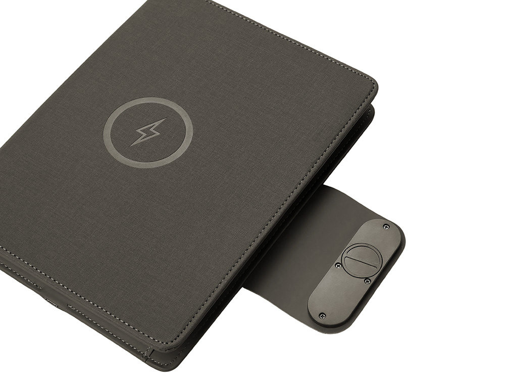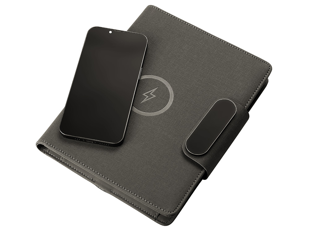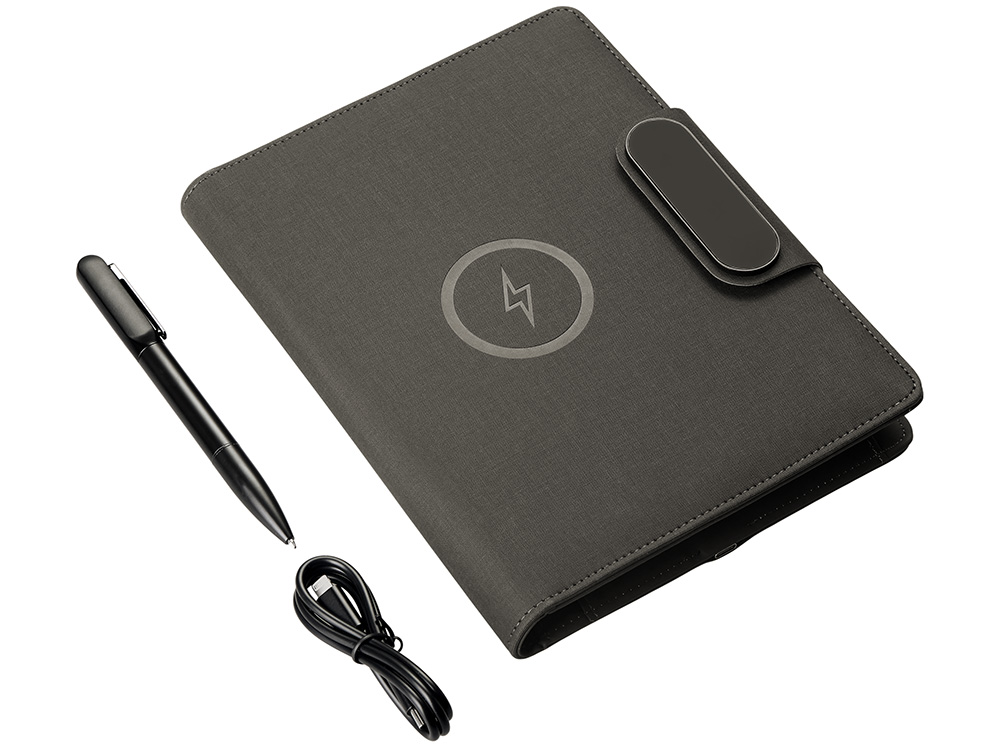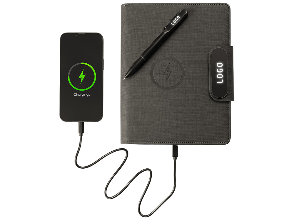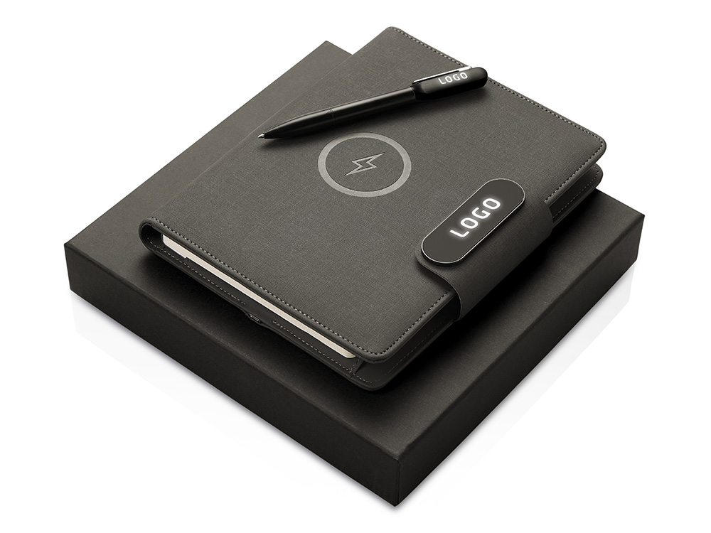 Подарочный набор Twilight — стильный и современный бизнес-подарок, который в полной мере воплощает идею многофункциональности. Он состоит из органайзера формата А5, с помощью которого можно заряжать гаджеты как беспроводным способом, так и через кабель, фиксировать телефон для просмотра видео или проведения конференций, хранить ручку и делать записи, а также самой металлической ручки. Клапан органайзера и в верхняя часть ручки светятся при гравировке логотипа, что делает набор стильным, а лого более ярким и заметным. Практичный и технологичный аксессуар, который в состоянии заменить сразу несколько вещей. - Встроенный пауэрбанк емкостью 5000 мАh. - Возможность зарядки как беспроводным способом, так и через кабель. - Удобная магнитная застежка. - Качественные материалы. - Подставка для телефона. - Блокнот для записей 64 л. - Светящийся при гравировке логотип.