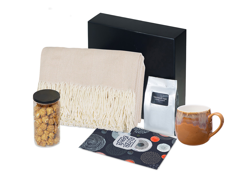 | Материал товара | плед - 100% хлопок, кружка - костяной фарфор с покрытием софт-тач, чай - пластик, попкорн - пластик, металл, мешок - нетканый материал (спанбонд), коробка - картон |