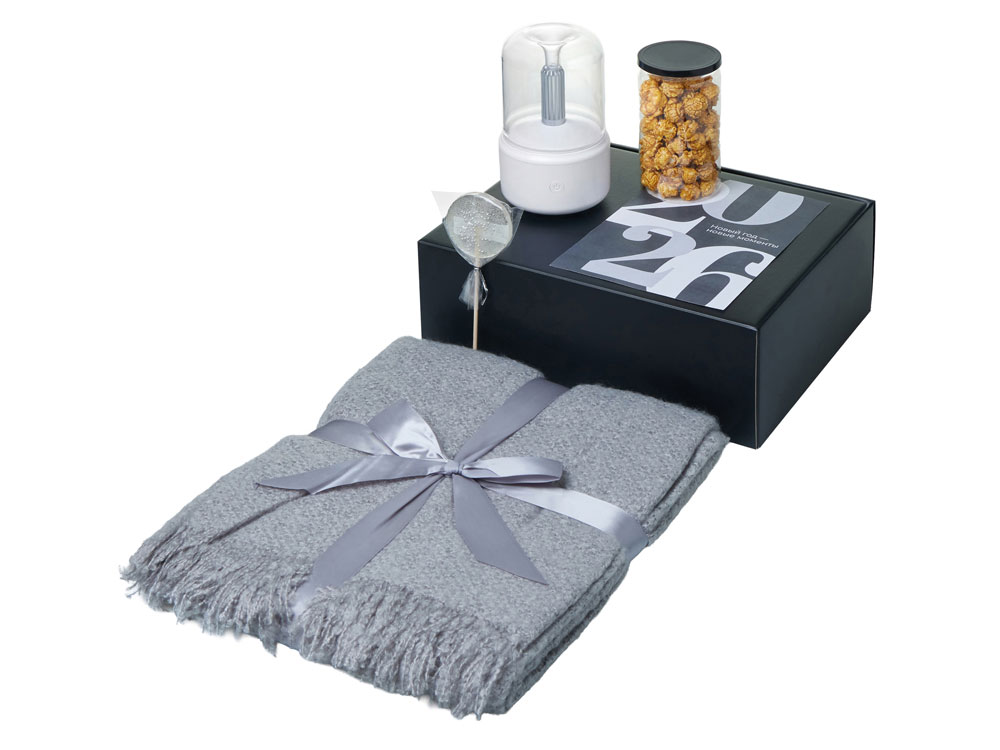 Подарочный набор с пледом, увлажнителем и попкорном, серый купить оптом и в розницу с нанесением логотипа в Нижнем Новгороде