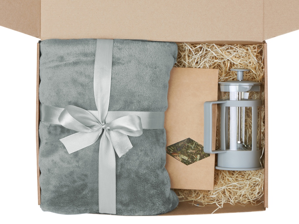 Набор продуман до мелочей. Когда зимним вечером подходит время чая, хочет завернуться в мягкий и теплый плед и наслаждаться любимым напитком, который можно заварить во френч прессе, входящем в комплект. Набор упакован в стильную крафтовую коробку.