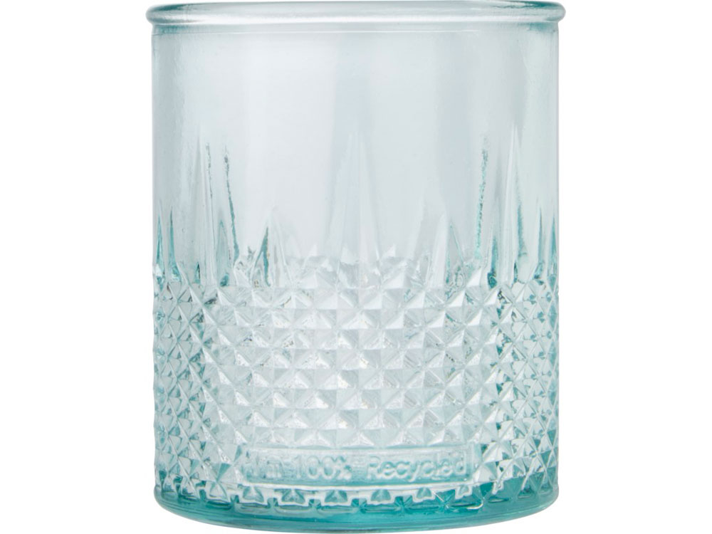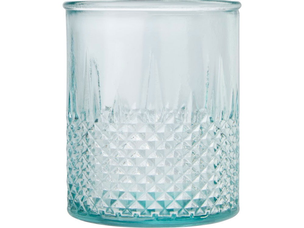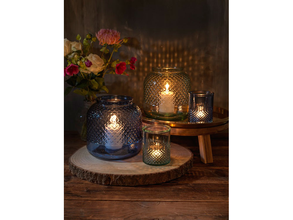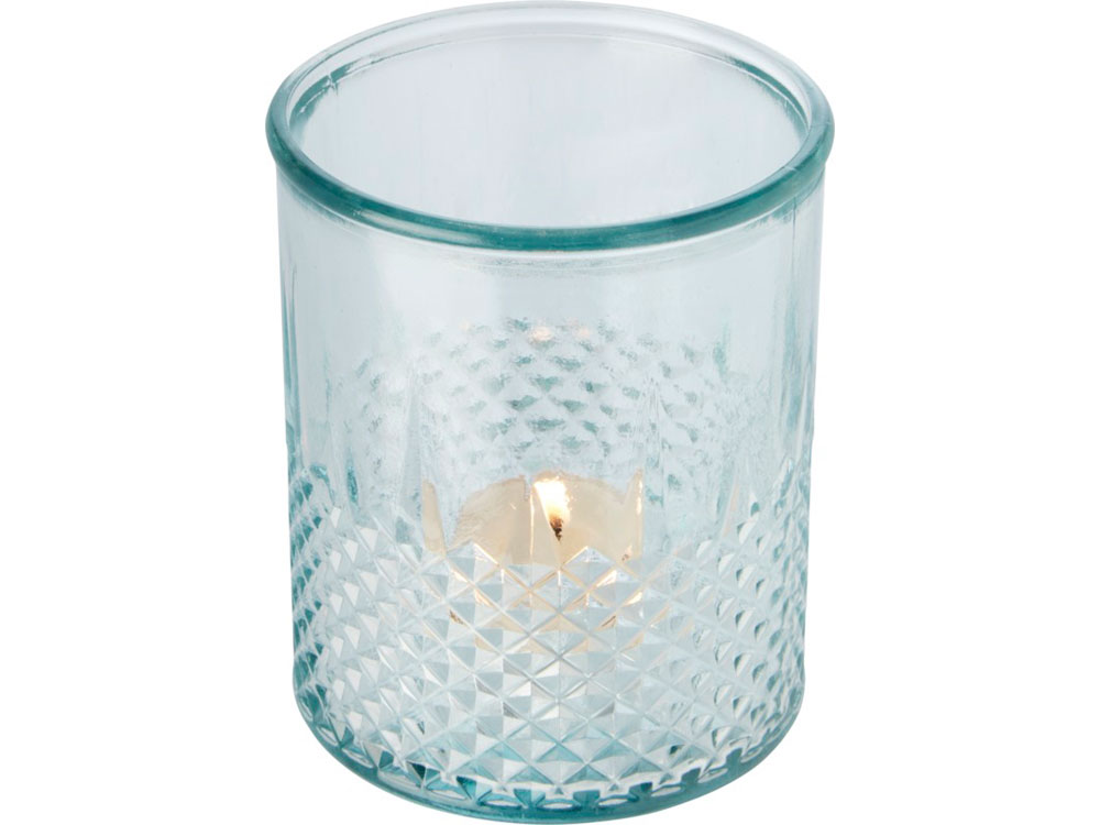 Подставка для чайной свечи из переработанного стекла с алмазным рельефом. Для создания этой подставки была использована 1 стеклянная переработанная бутылка. Переработанное стекло не отличается ничем по качеству от обычного, но при этом является более экологичным, ведь на изготовление этого материала тратится меньше энергии, сырья и примесей. Чайная свеча не входит в комплект.