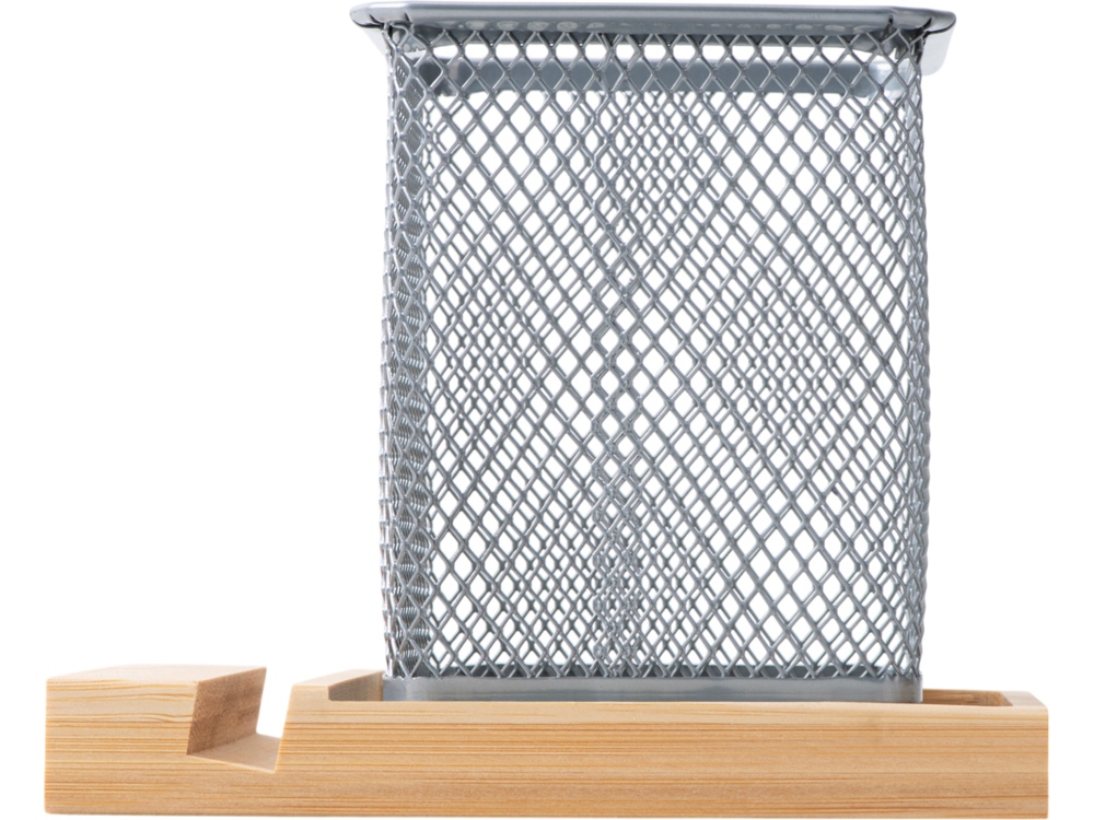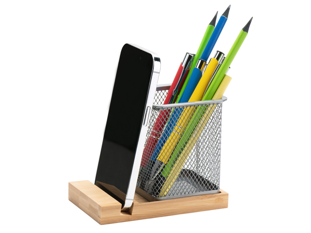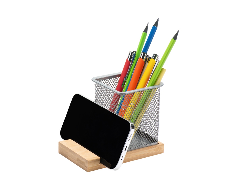 Функциональная подставка для ручек и карандашей, выполнена из прочного алюминия и установлена на бамбуковой основе. Элегантный дизайн этой подставки позволяет поддерживать порядок на вашем рабочем столе, обеспечивая легкий доступ к необходимым канцелярским принадлежностям. Особенностью бамбуковой подставки является небольшая выемка, в которую удобно можно установить телефон, чтобы он всегда был под рукой. Эта подставка гармонично сочетает стиль и практичность, добавляя уют и организованность в ваше рабочее пространство.