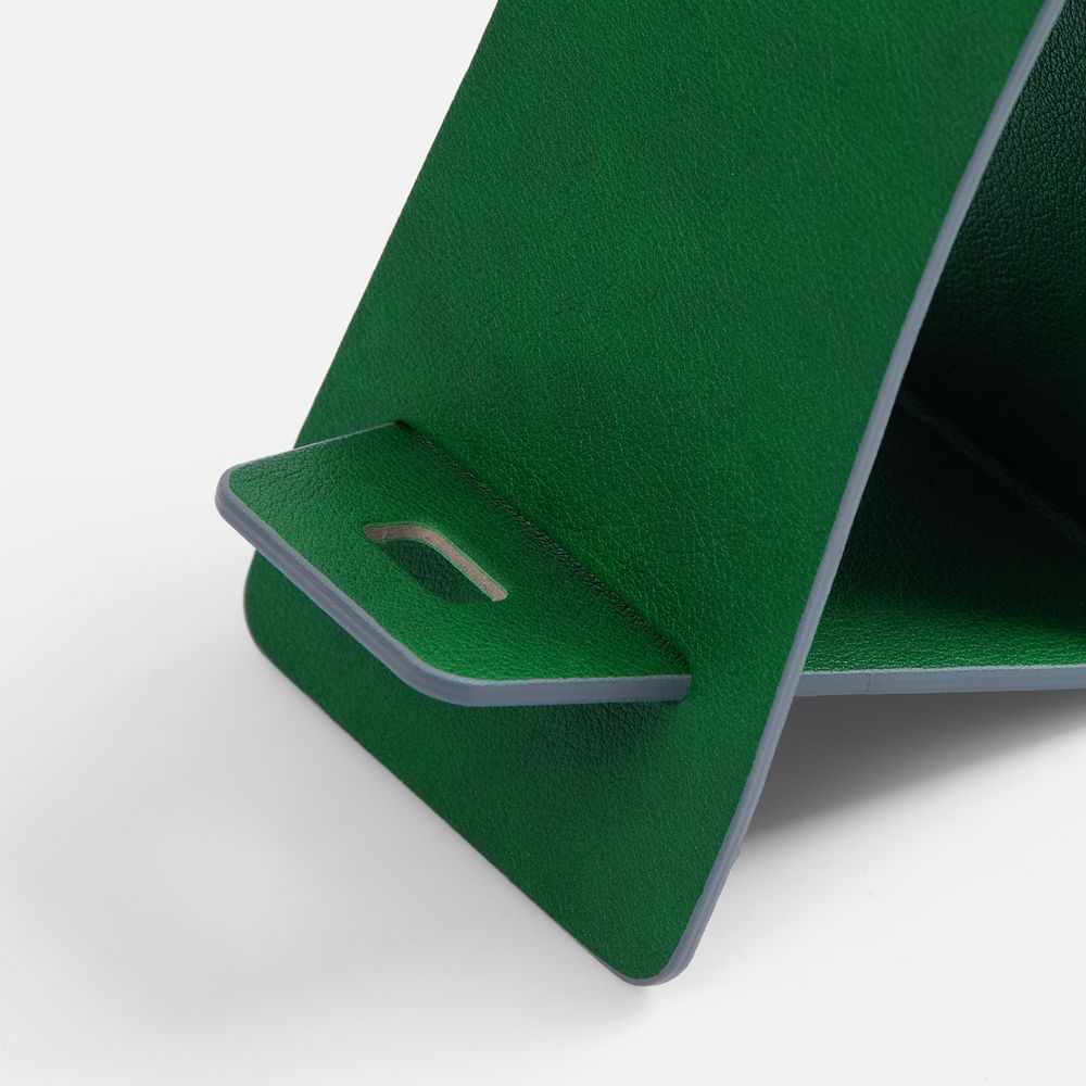 Складная подставка для телефона с вырубкой под шнур зарядного устройства. Выполнена из материала Petrus.