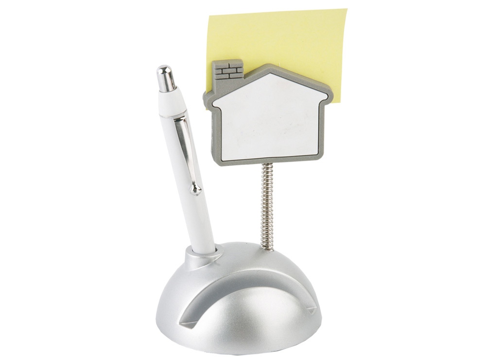 Подставка для визиток и ручки с держателем для бумаги Домик, серебристый/белый (Р) купить оптом и в розницу с нанесением логотипа в Нижнем Новгороде