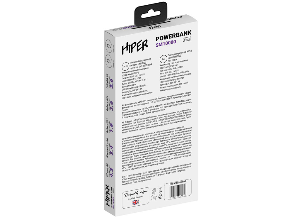 Портативный внешний аккумулятор HIPER SM10000 емкостью 10000 мАч (37Втч) оснащён входом USB-C для зарядки, Micro-USB входом для зарядки, 2xUSB-A выходами, максимальный выходной ток 2,1А, максимальная мощность 12 Вт.