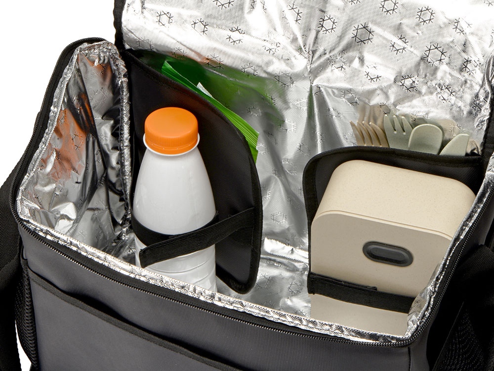 Раскладывается в удобное место для принятие пищи во время пикника на природе благодаря особой конструкции с молниями. Внутри карманы для всего необходимого и держатели на липучках для бутылок. Внутренняя подкладка из пены толщиной 3 мм. Широкая лямка регулируется по длине. 2 боковых сетчатых кармана.