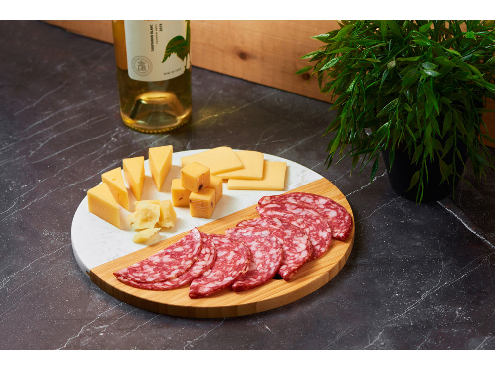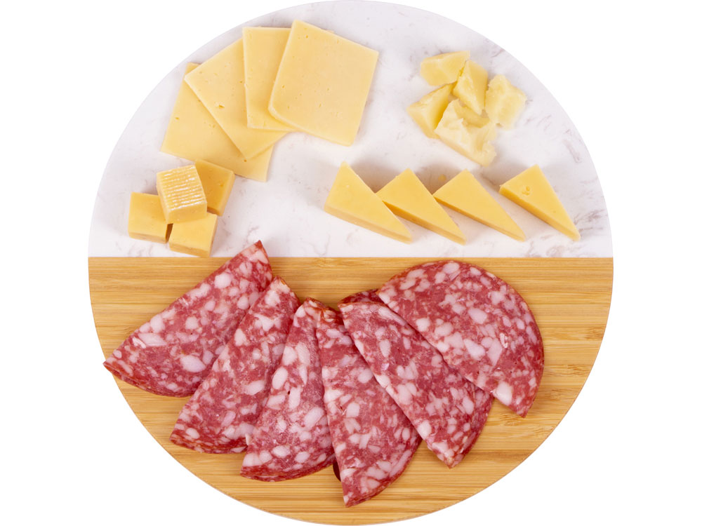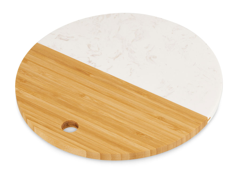 Разделочная доска от Eat&Bite состоит наполовину из бамбука, а вторая половина выполнена из мрамора. Это позволяет не только использовать доску для разделки, но и оригинально подать закуски, сыры или нарезки, зонируя виды снеков. - можно сочетать с другими товарами бренда Eat&Bite в сетах - для разделки и сервировки - необычное сочетание искусственного мрамора и бамбука можно обыграть интересным образом при помощи нанесения — например, при помощи надписей, бегущих в разные стороны, или выбором изображений, обыгрывающих разницу материалов - ушко для подвешивания Не рекомендуется мыть доску в посудомоечных машинах.