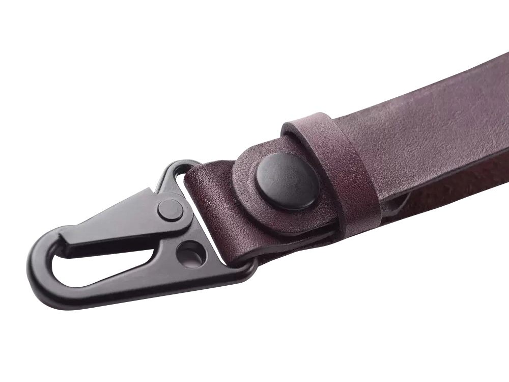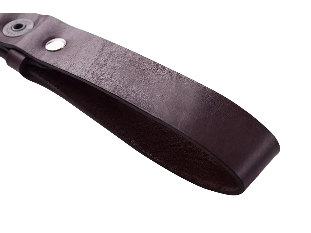 Ремешок сшит из прочной кожи коричневого цвета. Оборудован надёжным металлическим карабином, самопроизвольное расцепление которого невозможно. Ключи, прицепленные к нему, обречены вечно храниться в глубинах сумки или кармана джинсов, и у них нет ни единого шанса потеряться. Прицепить ремешок можно к шлёвке джинсов или к куртке.