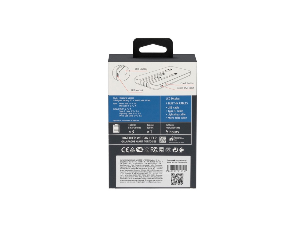Литий-полимерный внешний аккумулятор емкостью 10000 мАч. Цифровой дисплей показывает уровень заряда. Защита от перегрузок, короткого замыкания, чрезмерного заряда и разряда. Автоматическое включение/выключение. Достаточно подключить кабель к разъему мобильного устройства и начнется заряд. Сквозной заряд - можно одновременно заряжать телефон и сам аккумулятор. Количество зарядов смартфона до 3 раз. (Зависит от емкости аккумулятора смартфона). ОСНОВНЫЕ ПРЕИМУЩЕСТВА: 4 встроенных кабеля - не надо искать подходящий кабель для Вашего телефона! Цифровой дисплей. Сквозной заряд.