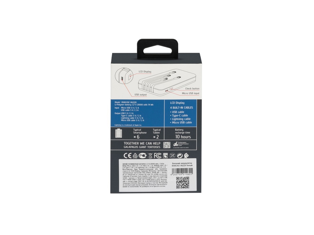 RIVACASE VA2220 (20000 мАч) внешний аккумулятор с дисплеем и встроенными кабелями, белый, 12/24 купить оптом и в розницу с нанесением логотипа в Нижнем Новгороде