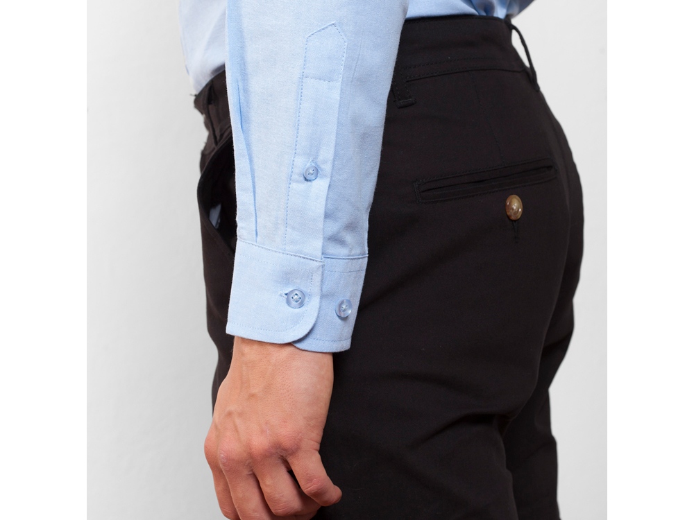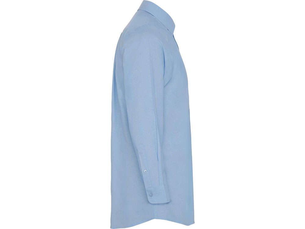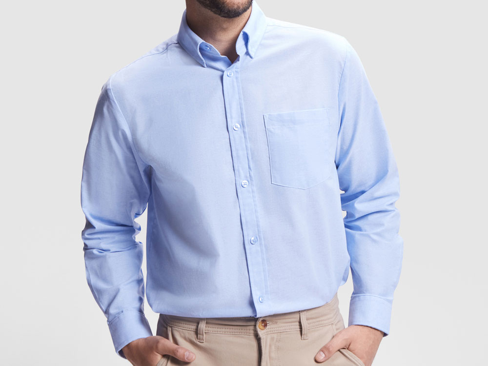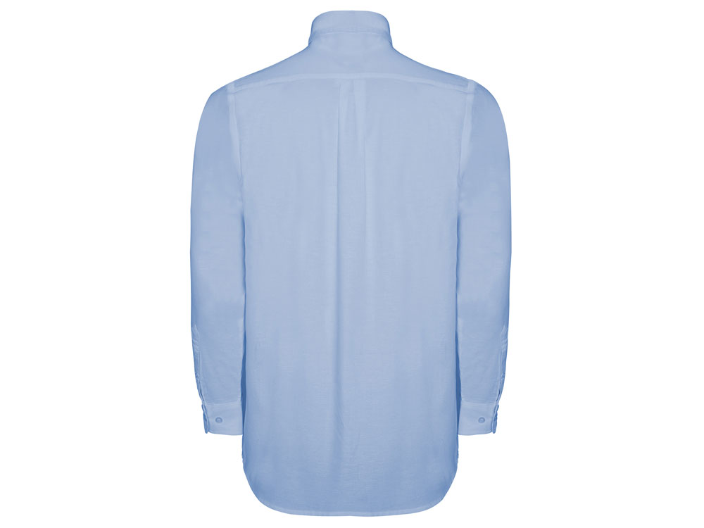 Мужская рубашка с длинным рукавом, накладной карман слева. Планка на пуговицах. Отложной воротник на стойке. Манжета регулируется по ширине с помощью 2-х пуговиц. Кокетка на спинке.