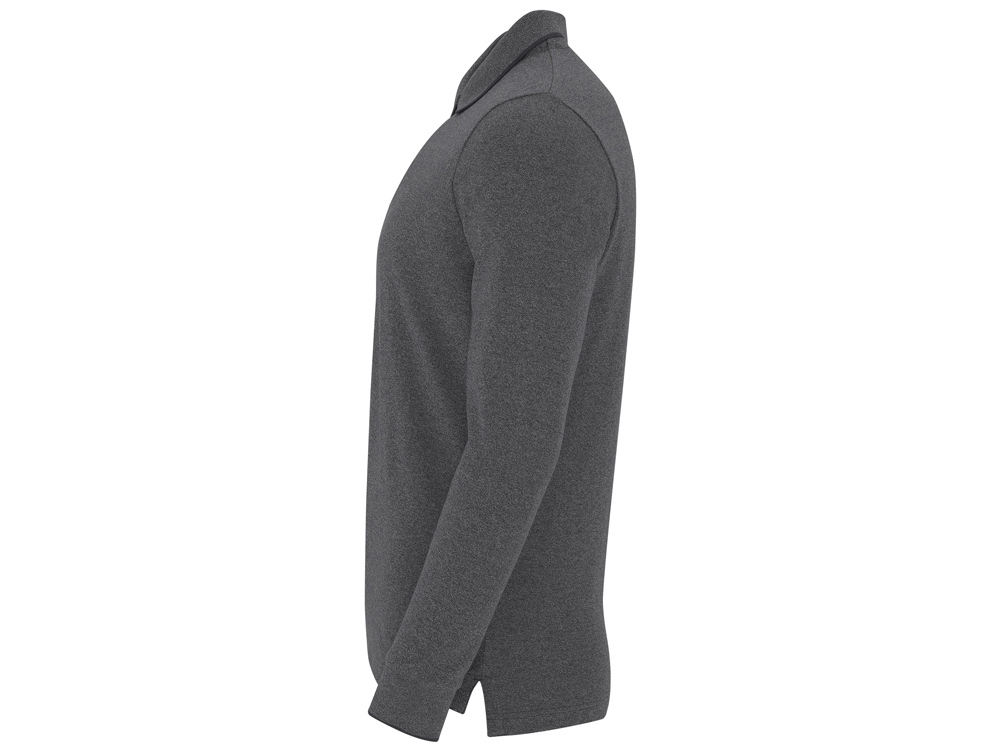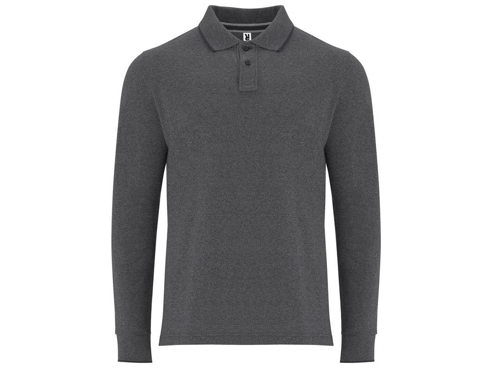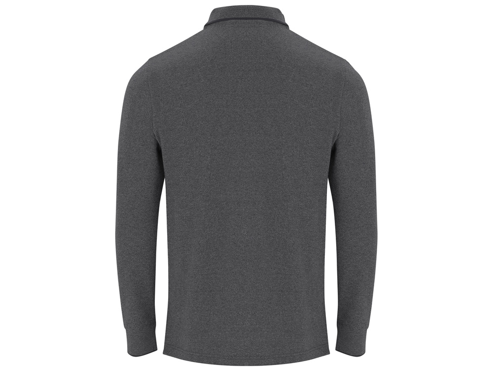 Поло с длинным рукавом из полотна с меланжевым эффектом. Планка с двумя пуговицами. Однотонная полоска по воротнику и манжетам. Разрезы в боковых швах отделаны контрастной тесьмой. Спинка длиннее полочки.