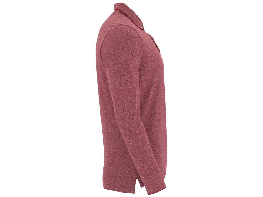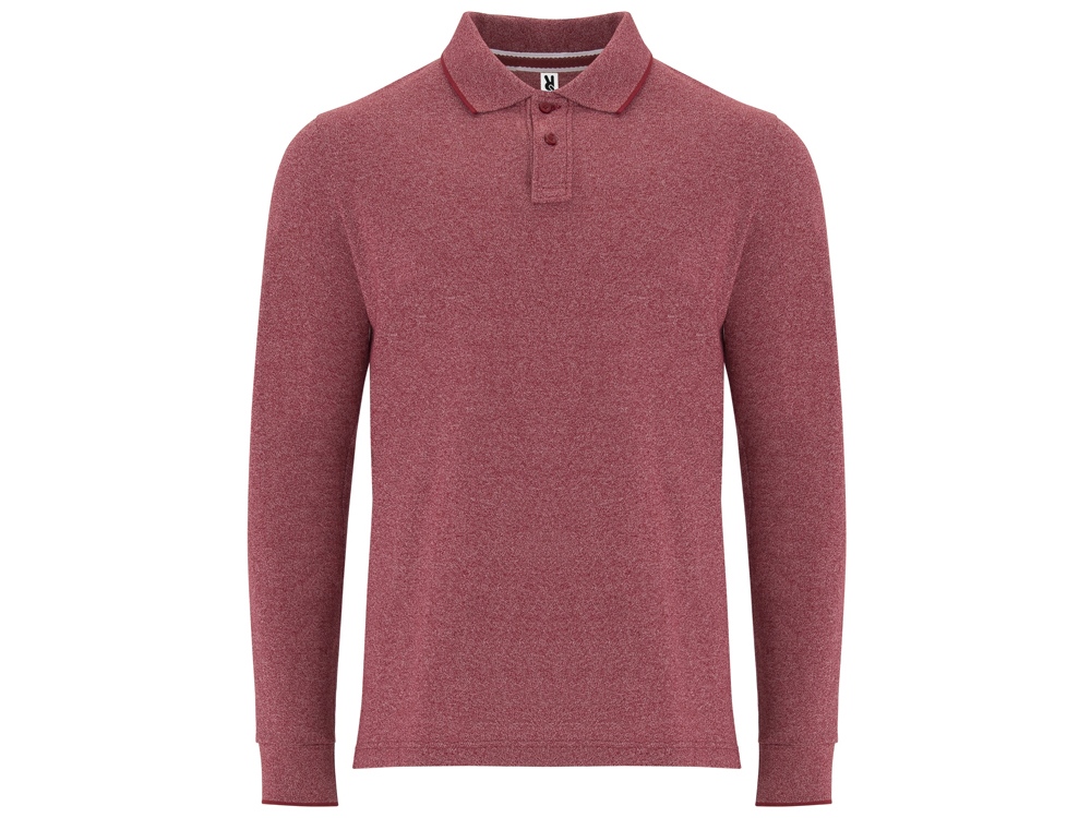 Поло с длинным рукавом из полотна с меланжевым эффектом. Планка с двумя пуговицами. Однотонная полоска по воротнику и манжетам. Разрезы в боковых швах отделаны контрастной тесьмой. Спинка длиннее полочки.