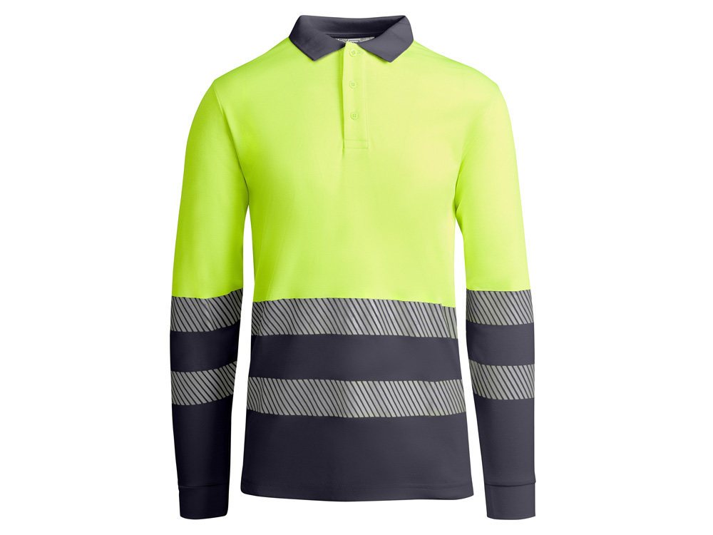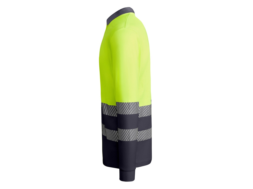 Рубашка поло с длинным рукавом и воротником в рубчик 1x1. Планка с застежкой на 3 пуговицы. Две светоотражающие сегментированные полосы на груди и рукавах. Микс полиэстера и хлопка для повышенной воздухопроницаемости. Дополнительный карман.