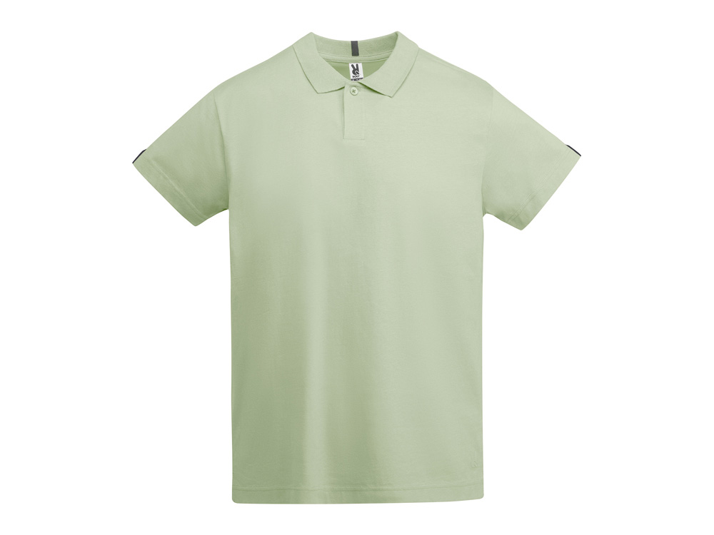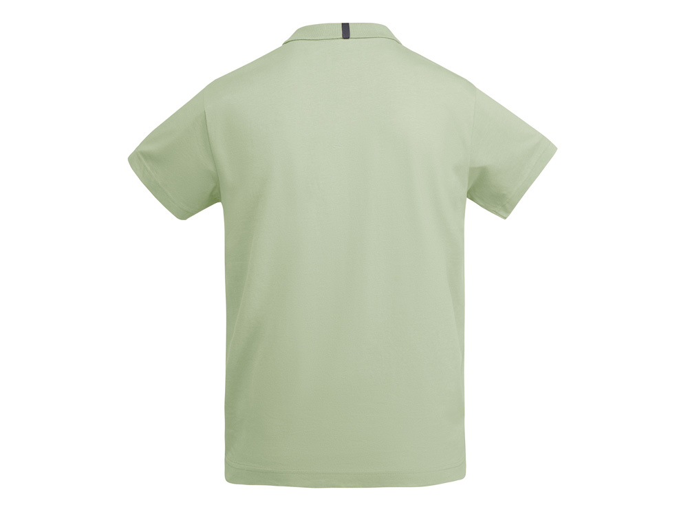 Рубашка поло с коротким рукавом из однотонного трикотажа. Воротник в рубчик 1x1. Разрез с застежкой на 1 пуговицу. Усиленные закрытые швы в воротнике. Боковые разрезы на подоле. Контрастная тесьма в елочку по низу рукава и на воротнике. Логотип Roly внутри.