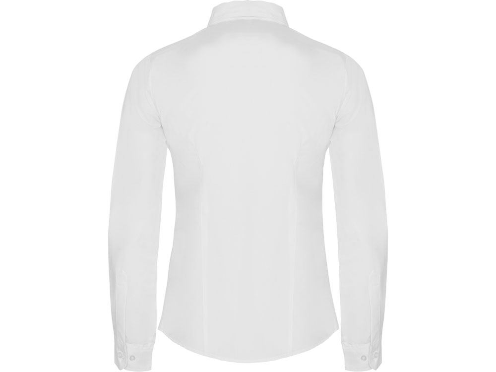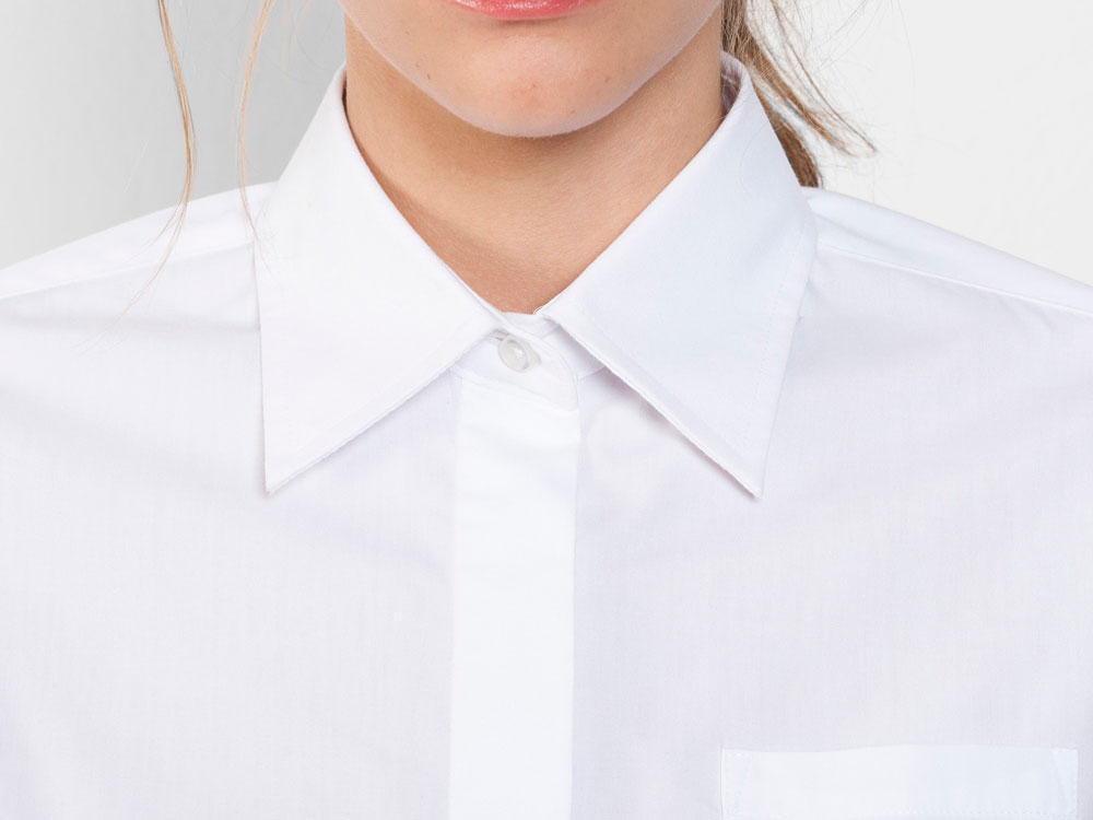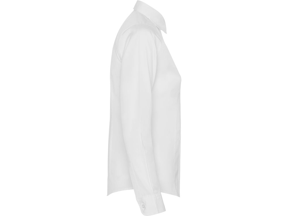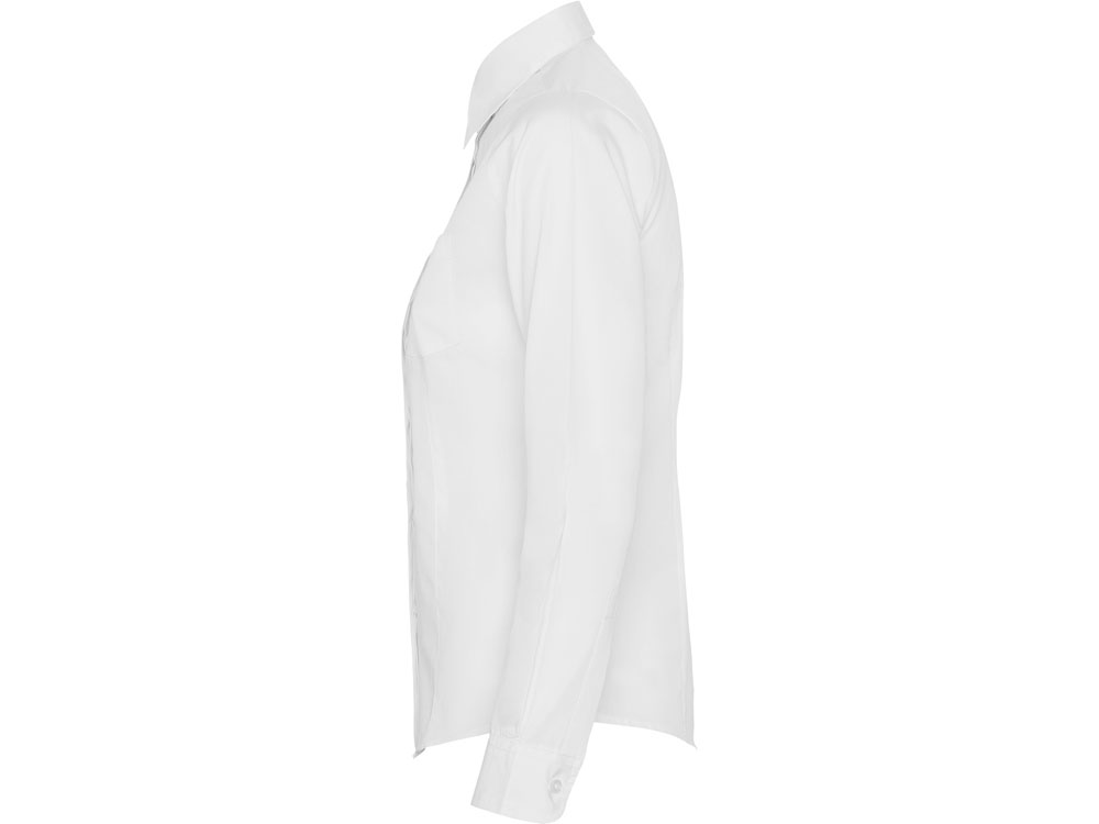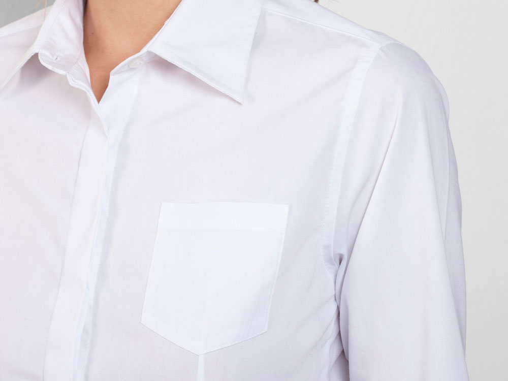 Рубашка женская прилегающего силуэта с длинным рукавом, вытачки на полочке и спинке. Накладной карман на груди слева, закругленный низ изделия. Планка с потайными пуговицами.