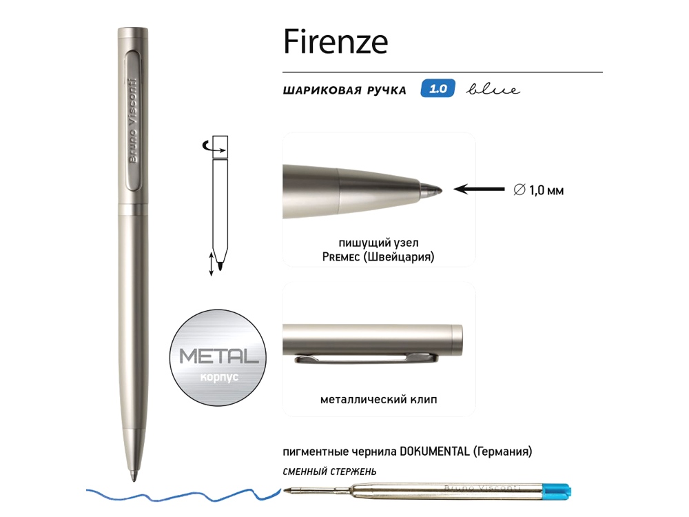 Шариковая металлическая ручка из коллекции Firenze от Bruno Visconti - бизнес-аксессуар, с которым вы всегда будете чувствовать себя уверенно и комфортно. Лаконичный дизайн, строгость формы, прочный металлический корпус цвета шампань подчеркнут статус владельца ручки. Ручка автоматическая, с легким поворотным механизмом подачи стержня. Надежный пишущий узел d 1,0 мм (от швейцарского производителя Premec) гарантирует высокое качество так же, как и пигментные чернила Dokumental (Германия). Благодаря им писать ручкой Firenze одно удовольствие – она мягко скользит по поверхности бумаги, оставляя ровную, четкую линию.