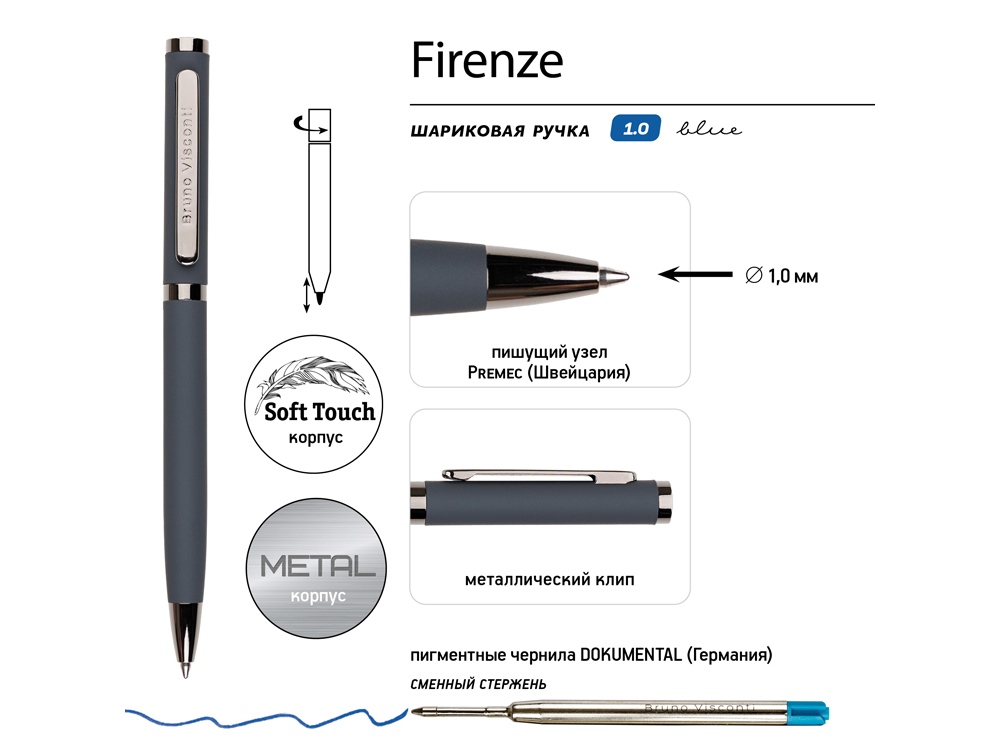 Шариковая металлическая ручка из коллекции Firenze от Bruno Visconti - бизнес-аксессуар, с которым вы всегда будете чувствовать себя уверенно и комфортно. Лаконичный дизайн, прочный металлический корпус, строгость формы подчеркнут статус владельца ручки. Удобство в эксплуатации и тактильно приятные ощущения подарит бархатистое покрытие Soft Touch. Ручка автоматическая, с легким поворотным механизмом подачи стержня. Надежный пишущий узел d 1,0 мм (от швейцарского производителя Premec) гарантирует высокое качество также, как и пигментные чернила Dokumental (Германия). Благодаря им писать ручкой Firenze одно удовольствие – она мягко скользит по поверхности бумаги, оставляя ровную, четкую линию.