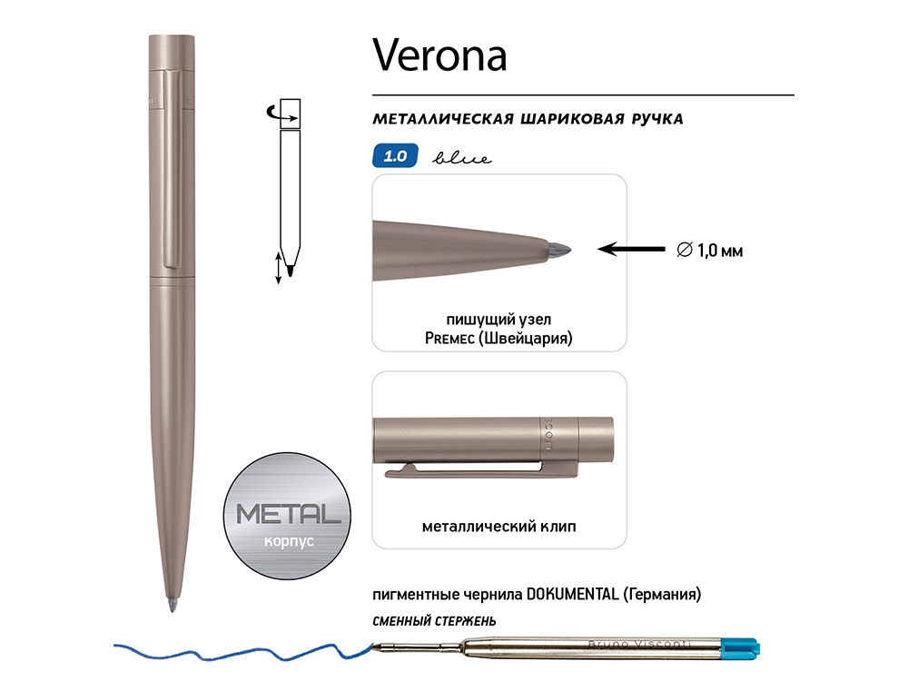 Металлическая шариковая ручка Verona - аксессуар, призванный стать настоящим элементом стиля, подчеркнуть индивидуальность его владельца. Как и все подарочные ручки Bruno Visconti, Verona - обладательница стержня с пишущим узлом от швейцарского производителя Premec и перманентными чернилами немецкого производителя Dokumental. Поэтому можно быть абсолютно уверенным в качестве письма. Сам стержень легко и бесперебойно выдвигается за счет мягкого поворотного механизма подачи. В ручке нет ничего лишнего, но она привлекает к себе внимание. Несмотря на увеличенный диаметр корпуса - 12 мм, она изящна благодаря плавным линиям, эргономичному корпусу цвета шампань.