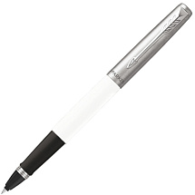 Ручка-роллер Parker из коллекции Jotter Originals выполнена из нержавеющей стали, а также пластика. Декоративные элементы отделаны хромом. Ручка упакована в оригинальную картонную подарочную коробку Parker. В комплекте идет стержень роллер черного цвета, он находится под платформой с ручкой.