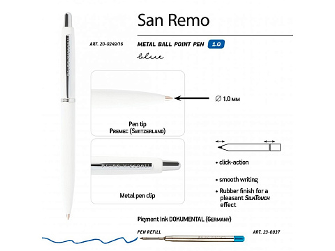 Ручка SAN REMO шариковая, автоматическая, белый металлический корпус 1.00 мм, синяя
