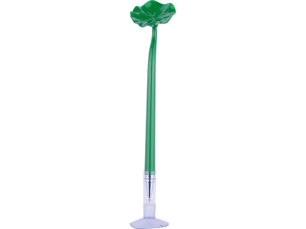 Шариковая ручка выполнена в оригинальном дизайне с листочком кувшинки на конце. Такая ручка никогда не потеряется, ведь ее можно крепить на столе при помощи присоски.