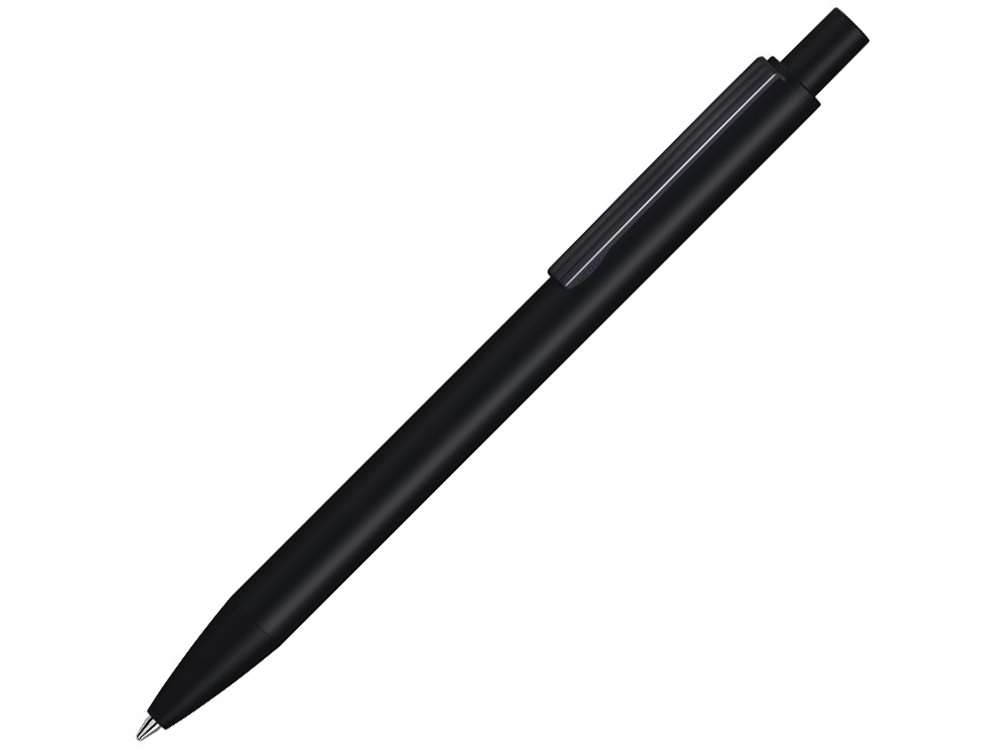 Автоматическая шариковая ручка с матовым тонированным черным корпусом и цветным наконечником, широким изогнутым клипом.