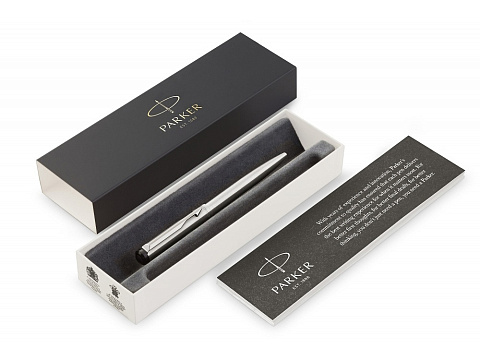 Шариковая ручка, нажимной механизм Материал корпуса: Нержавеющая сталь Материал отделки деталей корпуса: Нержавеющая сталь Выгравированный логотип PARKER на корпусе ручки Цвет стержня: синий.